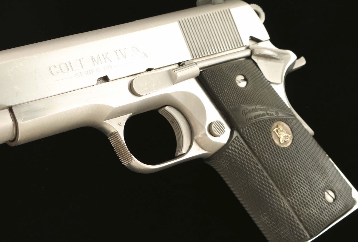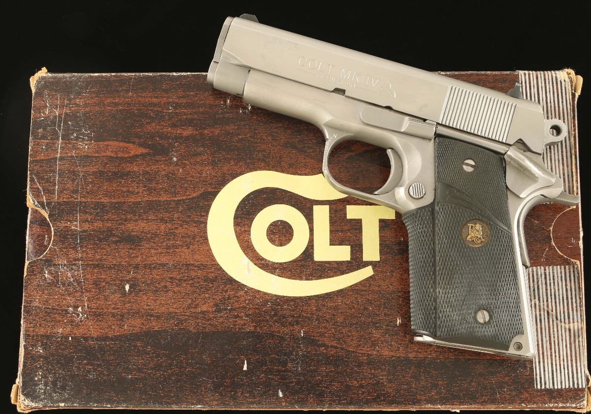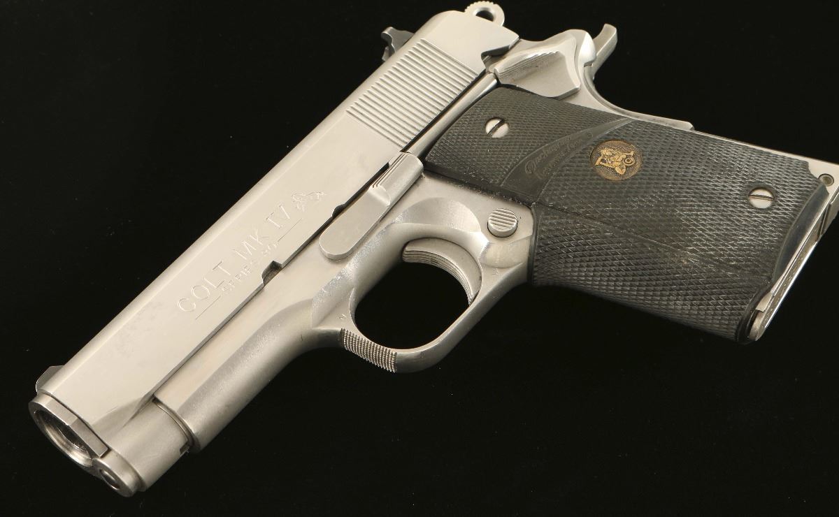 Out of production stainless steel semi automatic pistol chambered in .45 Automatic. Features a brushed finish, 3 1/2" barrel, three dot sights, serrated triggr, thumb safety, pudh button magazine release, beavertail grip safety, serrated round hammer spur, factory magazine and Pachmayr wrap-around checkered black rubber grips. Includes a colt wood grain box with matching label, documents and mix-matched foam inserts. Pistol exhibits light handling marks and a few small nicks. Action is tight & does not hold open on empty, bore is pristine and grips are very good.