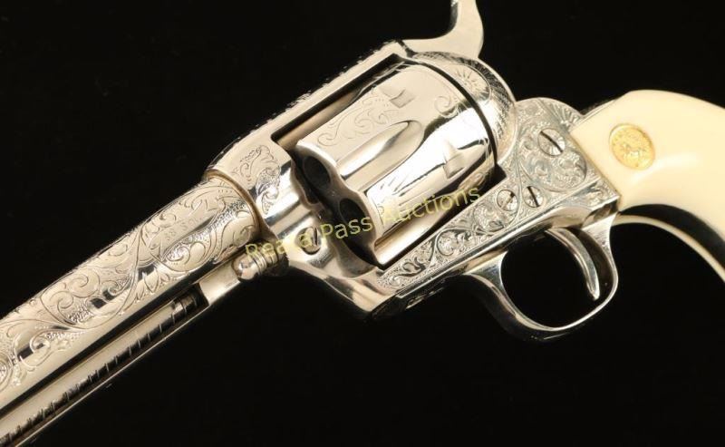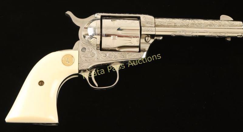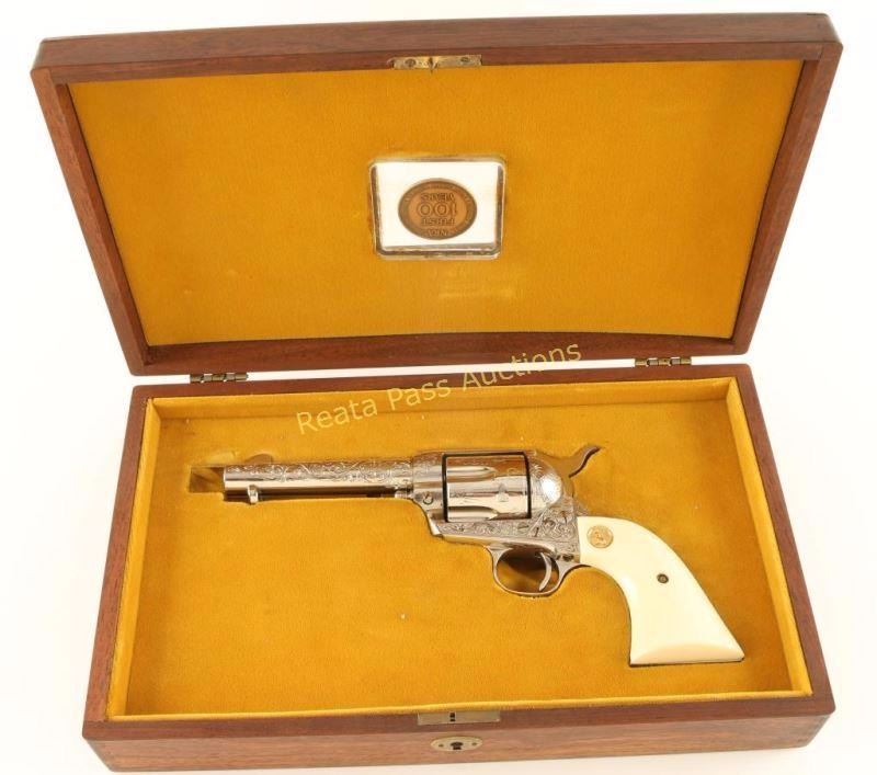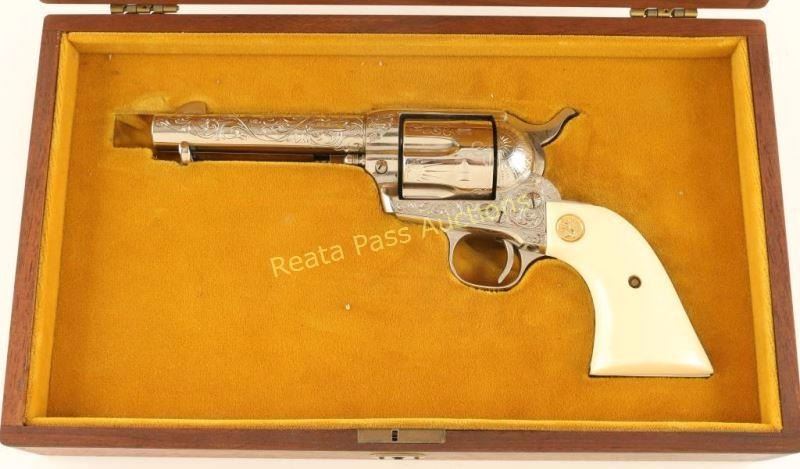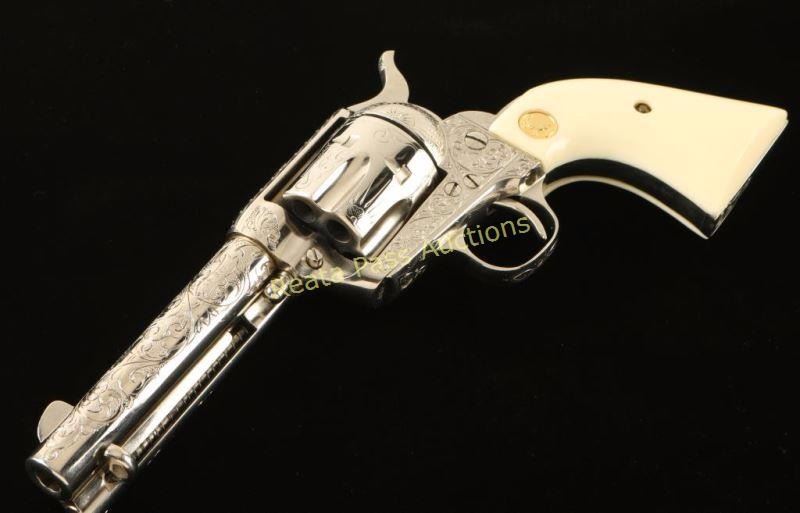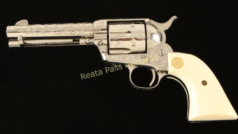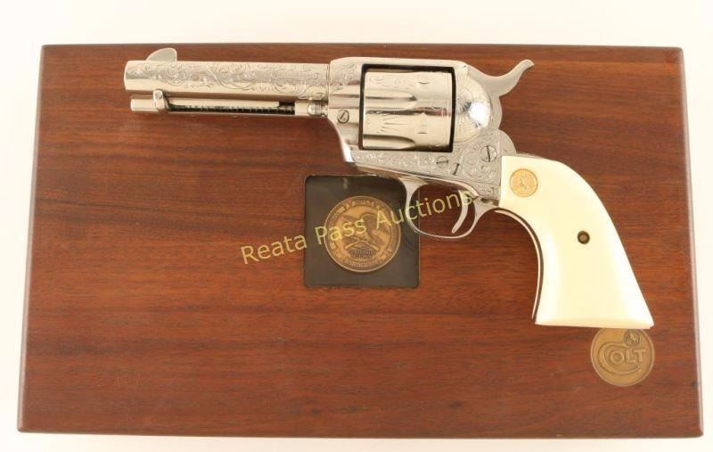 Cased & engraved single action revolver chambered in .38 Special. Features a nickel plated refinish, "c" coverage scroll engraving, 4 3/4" barrel with single line address, ejector rod, blade front sight, square notched rear sight, six-shot fluted cylinder, checkered hammer spur and Colt medallion two-piece faux ivory grips. Includes a Colt velvet lined display case with an inlayed NRA centennial coin in the lid. Revolver exhibits nearly all of it's nickel plated refinish showing a faint dragline and some light superficial scratches. The ejector handle seems to be bent slightly. Action is crisp, bore is excellent and faux-ivory grips are near fine. Condition is excellent. ***Modern Firearm***