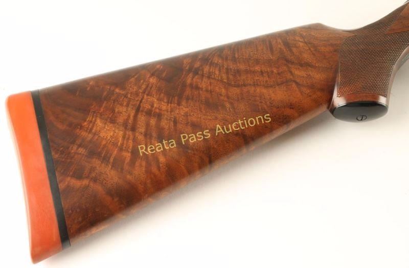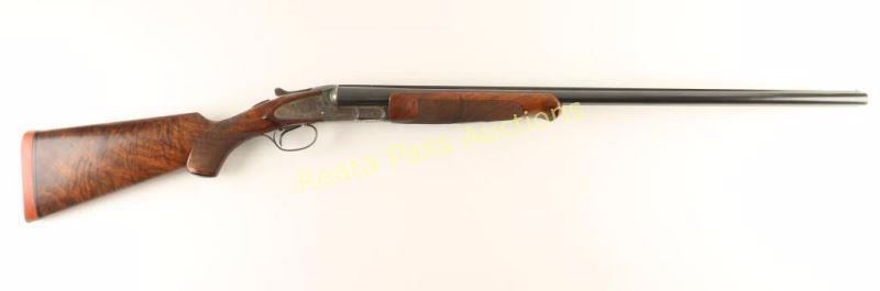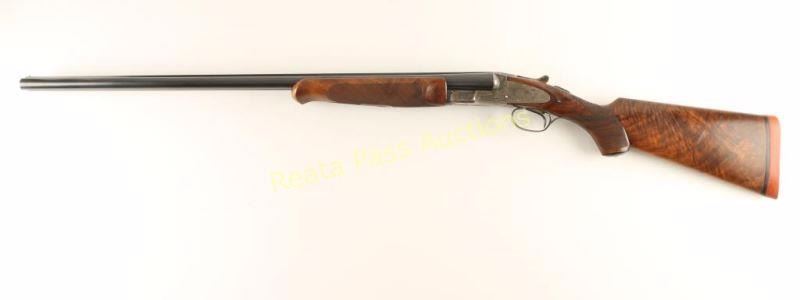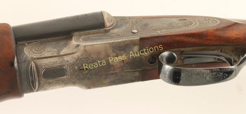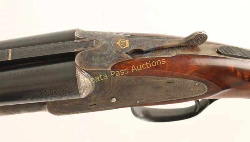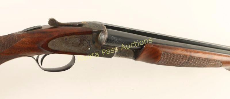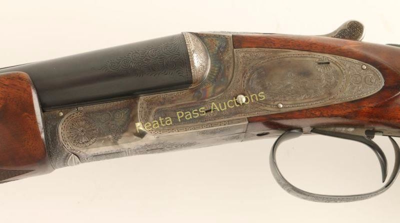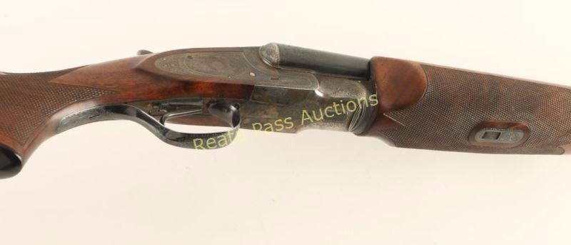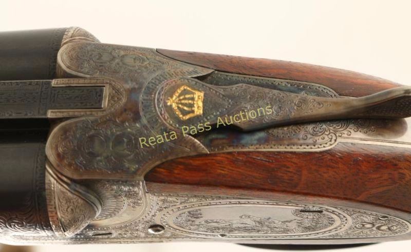 Extreme high quality American made side-by-side double barrel sidelock shotgun chambered for 16 gauge shells, circa 1920. Features 28" blued barrels with a raised matte rib, automatic ejectors, smooth single trigger with barrel selector along side of it, white bead sight, case hardened receiver with fine scroll engraving & ornate dog scenes, gold inlayed crown on the top lever, sliding tang safety, fancy checkered select walnut beavertail forend and pistol grip shoulder stock with black grip cap & unmarked recoil pad. Shotgun exhibits approximately 99%+ of it's blued refinish on the barrels and the receiver boasts vivid original case colors extending from the protected areas and ending with muted tones at the ends of the lock plates. Bores are excellent, action is sound, markings are sharp on the receiver with softer marking on the barrel and wood stocks are near fine with few small imperfections including a scrape on the left side of the shoulder stock. Condition is near excellent. ***C&R Firearm*** ***Modern Firearm***