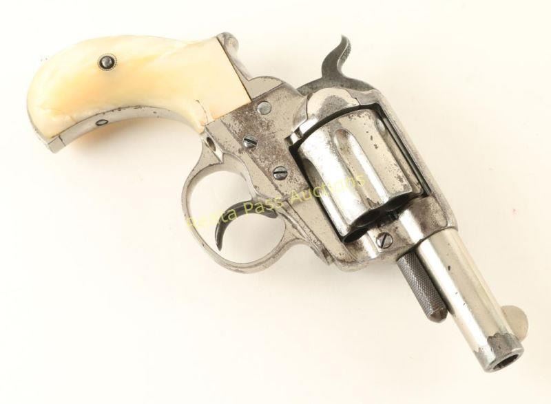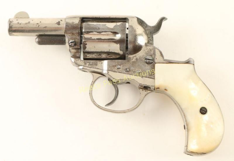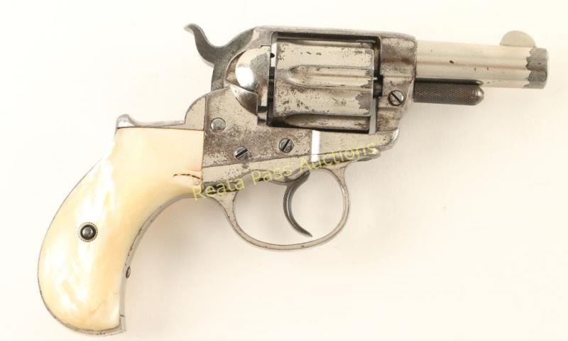 Antique 'Sheriff's Model' double action six-shot revolver chambered in .38 Colt, circa 1882. Featured a nickel plated finish, 2.5" acid-etched barrel with two line address, blade front sight, 'v' notched rear sight, long fluted cylinder, large checkered cylinder pin head, smooth trigger, checkered hammer spur and two piece mother-of-pearl grips. Revolver exhibits approximately 60% of it's original nickel plated finish with the balance turned to brown patina. Markings are good and all serial numbers match. Action is sound, bore is excellent and mother-of-pearl grips are very good with small losses to both panels & a repair at the toe on the right panel. Condition is very good. ***Antique Firearm***