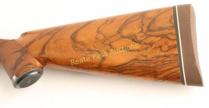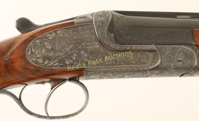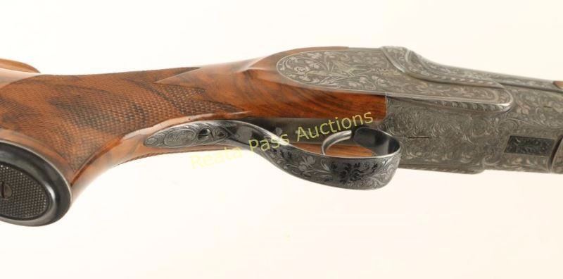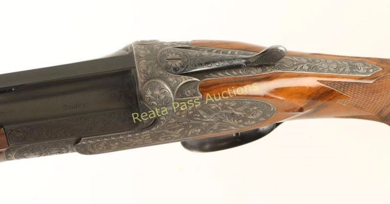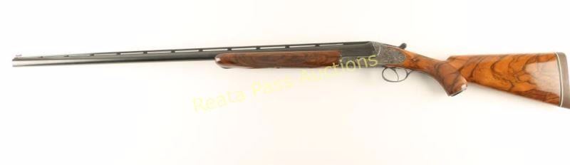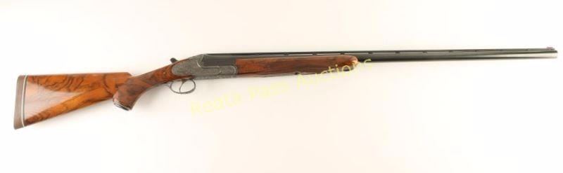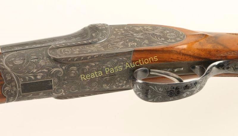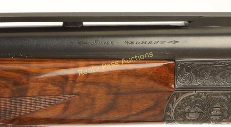 Finely crafted single shot skeet shotgun chambered for 12 gauge shells, made in Suhl, Germany. Features a blued finish, 32 1/4" barrel with Simmons raised vent rib, auto-ejector, hi vis front sight, beautifully scroll engraved receiver with duck & quail games scenes, smooth single trigger, checkered top lever and finely checkered figured wood beavertail forend with ebony inlay and pistol grip shoulder stock with checkered metal grip cap & aftermarket recoil pad. Barrel retains approximately 99% of it's blued finish which is likely a high quality refinish showing little wear. The receiver exhibits only traces of it's formally blued finish. Action is crisp, bore is pristine and wood stocks are extra fine. Condition is excellent. ***Modern Firearm***