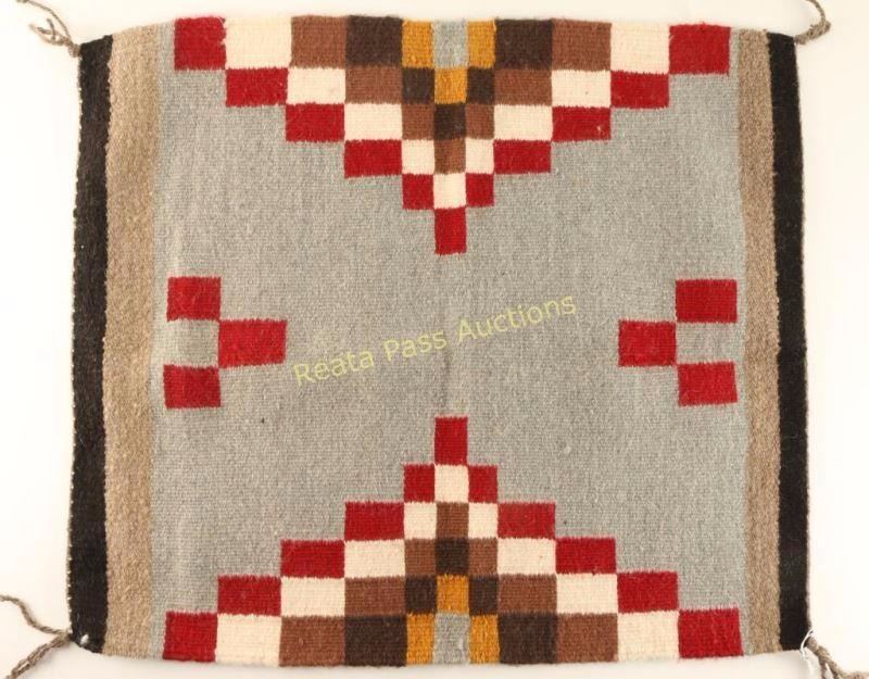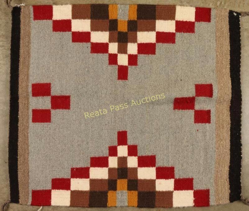With a geometric pattern in Red, White, Gray, Black, and Brown colors. In very good condition. Measures 24.5"X28.5".