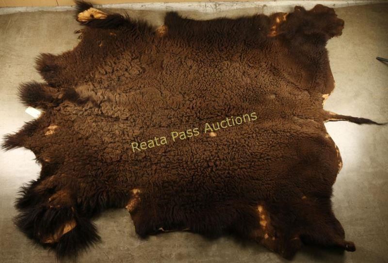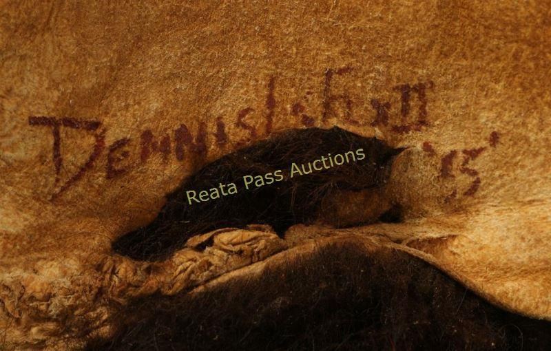 This is an original exceptionally painted Buffalo hide from the renowned Mandan-Hidatsa Native American Indian, Dennis R. Fox II. The piece shows a wonderful pinwheel painted design with quill work, blanket strip and medallion like painted accents and buffalo skull painted effigy's. The piece is signed, Dennis R FOX II 55. Denis Fox II, of the Fort Berthold Indian Reservation in North Dakota Indian name is shu-ga Nix-bitsi (DOG BEAR), is one of the most well known hide painters. He worked for the Smithsonian Institutions Folk Life Program in Washington, D.C. specializing in painted hides. The piece is in good condition shows some sewn patches in hide. The fur side of the hide is also in good condition with only a few small area showing fur loss. Measures 105"X83"
