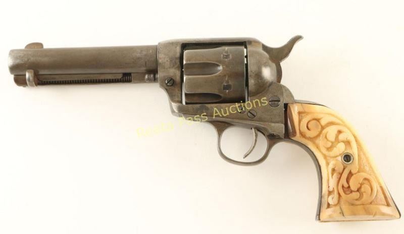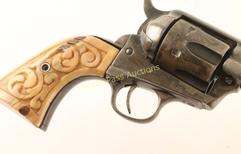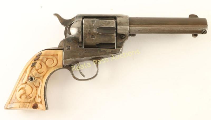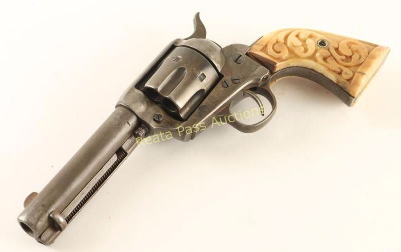 101 Ranch SA with a 4 3/4" bbl. Frame is marked '7' and '101'. Heavily worn finish, all matching serial numbers. Includes a scroll carved cow horn grips. Includes original tag from 2007 Cody Old West Auction which states it was shipped to Simmons Hardware-unverified by us. Revolver exhibits less that 10% of it's old refinish with a majority of the metal surfaces turned to a dull grey/brown patina. Barrel, ejector rod housing and front sight shows significant holster wear, action is crisp with a hair trigger, bore is good with light scattered pitting, markings are good and carved grips are very good as the are slightly ill-fitting and have a small chip on the left panel as well as a single notch. Condition is good. **C&R Firearm** **Modern Firearm**