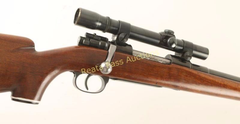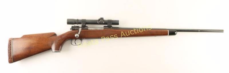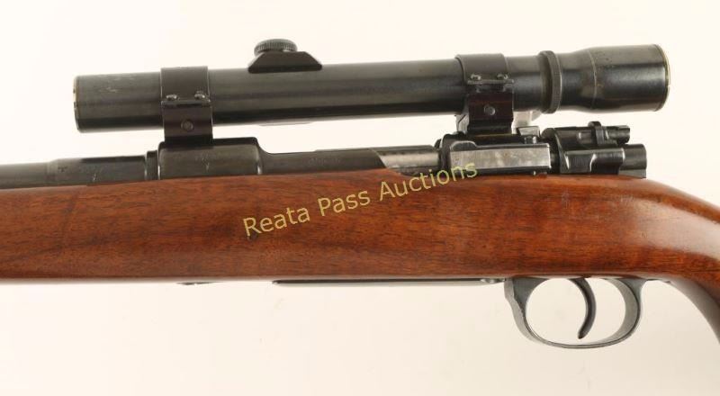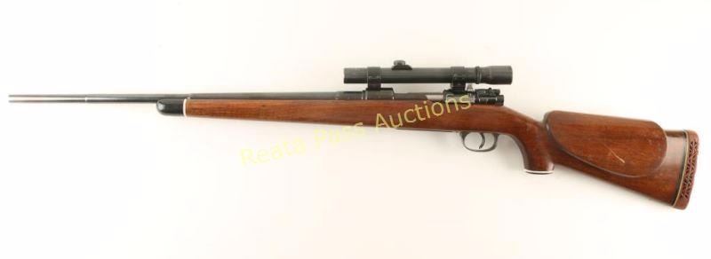 Sporterized Nazi proofed bolt action rifle chambered in 8mm Mauser, produced by J.P. Sauer circa 1939. Features a blued refinish, 24" tapered barrel drilled & tapped for a front sight with rear sight tap filled, Weaver K25 Scope with weaver rings, integral box magazine, jeweled bolt, aftermarket safety, and custom walnut pistol grip stock with black forend tip, cheek rest and rubber recoil pad. Markings: Barrel - 'S39D153' 'Germany' eagle/swastika and eagle/37 marked three times. Receiver - '147' '1939' 'Mod.98' eagle/swastika, eagle/359 and eagle/37 marked twice. All serial numbers are matching on the original parts. Rifle exhibits approximately 90% of it's blued refinish showing light use and wear. Action is smooth, bore is good, optics are slightly hazy and wood stock are good with some scrapes & dings. Condition is very good as sporterized. ***C&R Firearm*** ***Modern Firearm***