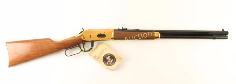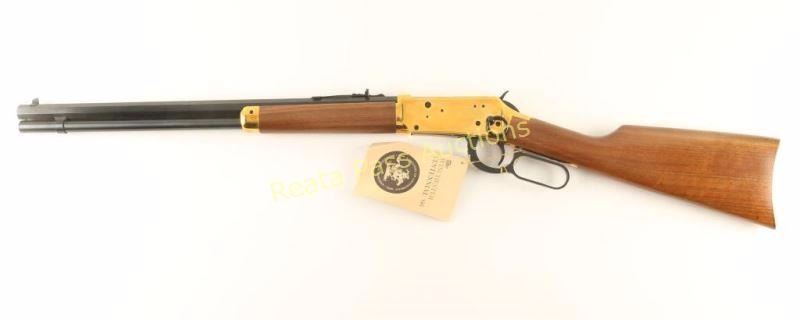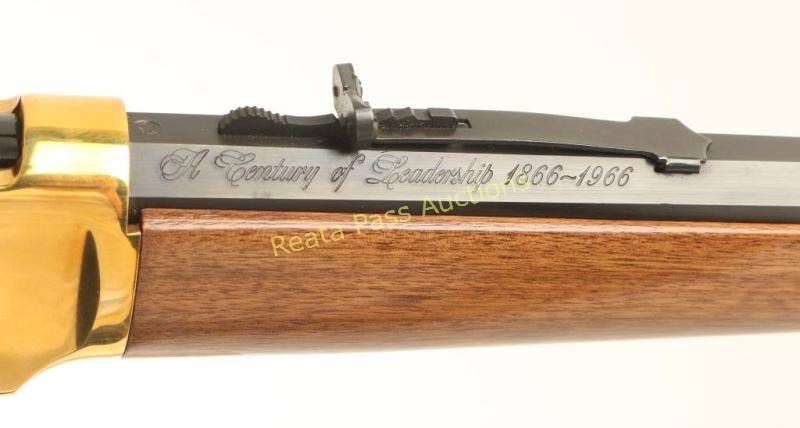 'SRC' Commemorative lever action repeating rifle chambered in .30-30 Winchester, circa 1966. One of only 102,309 produced, inscribed "A Century of Leadership 1866-1966" on barrel. Features a blued 20" octagonal barrel, full tube magazine, blade front sight, adjustable rear sporting sight, brass colored receiver, serrated hammer spur, beveled trigger, saddle ring, smooth wood forend with metal tip, and straight grip shoulder stock with metal buttplate. Includes original factory cardboard box. Rifle exhibits little to no wear on the blued surfaces, only fine superficial scratches on the receiver and a few small scattered spots of surface rust observed. Action is smooth, bore is very good+ and wood stocks are fine. Condition is near excellent in box. ***C&R Firearm*** ***Modern Firearm***