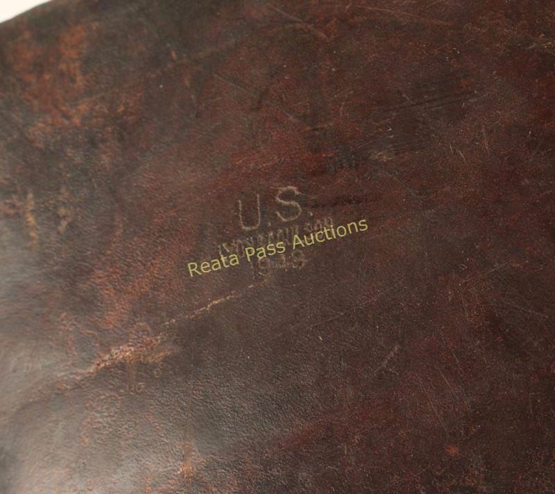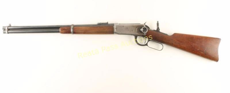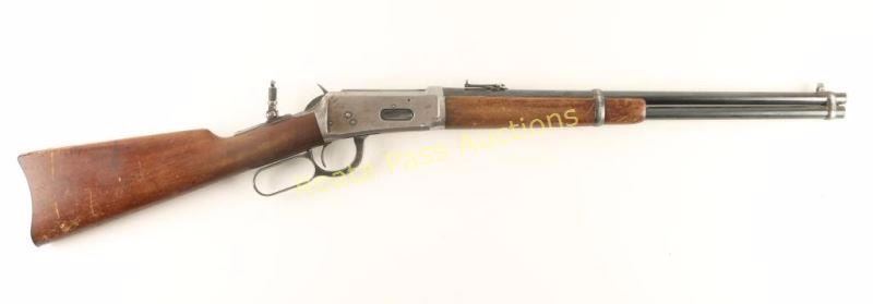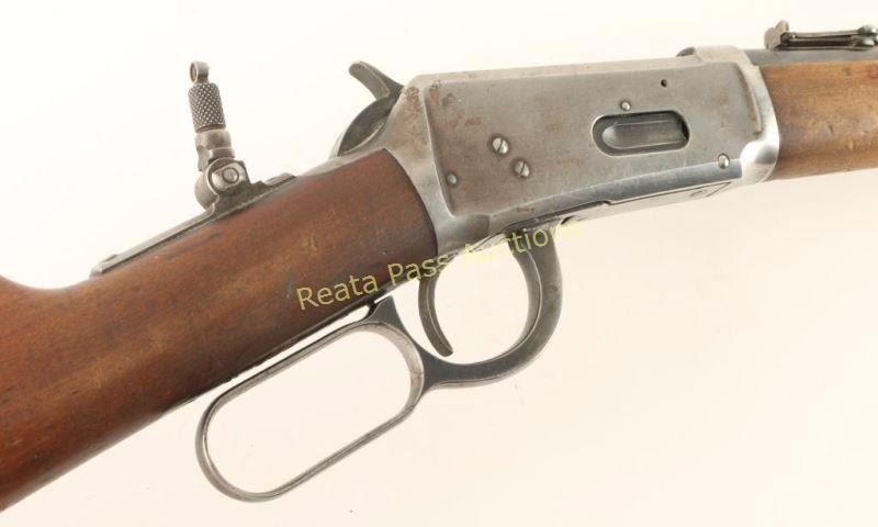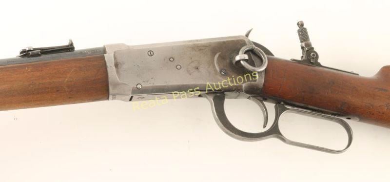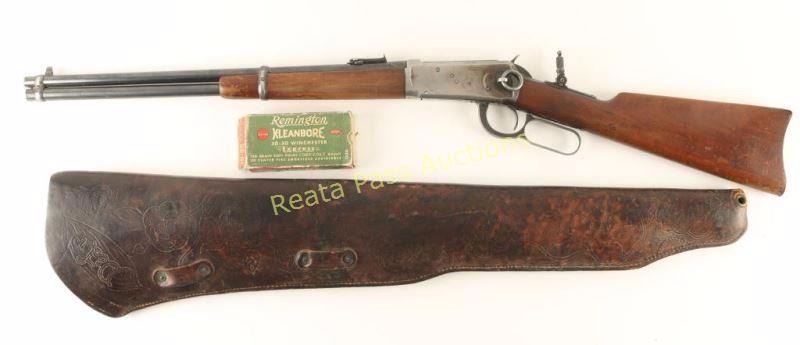 'Saddle Ring Carbine' Vintage lever action repeating rifle chambered in .30-30 Winchester, circa 1914. Features a blued finish, 20" barrel, full-length tube magazine, blade front sight, folding elevation rear sight, Lyman dual aperture adjustable tang sight, smooth trigger, checkered hammer spur, saddle ring, smooth walnut forend and straight grip shoulder stock with metal carbine buttplate. Includes a vintage box of Remington Kleanbore ammunition with eleven mixed rounds and a U.S, marked Lyon & Coulson brown leather scabbard for an 1895 rifle, dated 1943. The scabbard has been hand tooled with flowers and inscribed with the last name of the family from which this rifle came from and had been in for three generations. Rifle exhibits good honest wear with little finish intact on the receiver and approximately 85% finish retained on the barrel & magazine tube, showing some small scratches & light scattered dark oxidation/rust. Action is crisp, bore is excellent and wood stocks are good showing use. Condition is very good as vintage. ***C&R Firearm*** ***Modern Firearm***