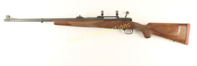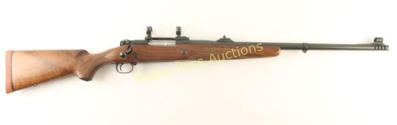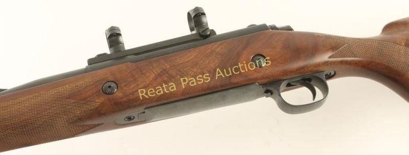 'Classic Super Express' Big bore bolt action sporting rifle chambered in .338 Winchester Magnum. Features a satin blued finish, 24" barrel with integral muzzle break, ramped & hooded front sight, adjustable single leaf rear express sight, Leupold scope base & rings, jeweled bolt with manual safety, integral box magazine with hinged floorplate, serrated wide trigger, swivel studs and checkered Monte Carlo dark walnut stock with recoil pad. Includes original factory box with documents and lock. Rifle exhibits approximately 99% of it's original finish showing very little use or wear. Action is very smooth, bore is excellent and wood stock is fine. Condition is like new in box. ***Modern Firearm***