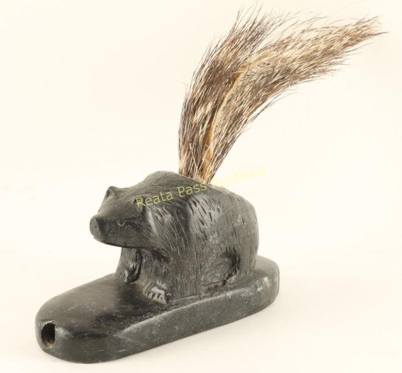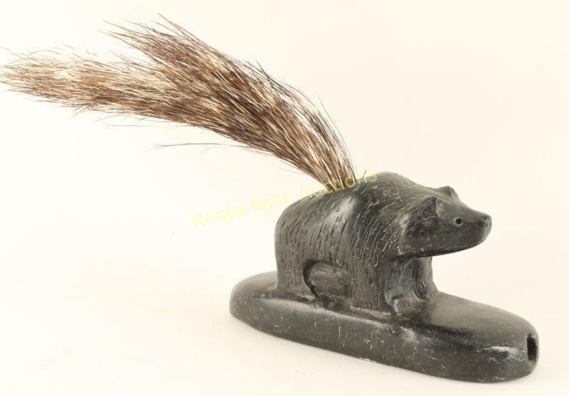 Carved setite bear sits on pipe platform. Javelina hair inserted into bowl of pipe.
