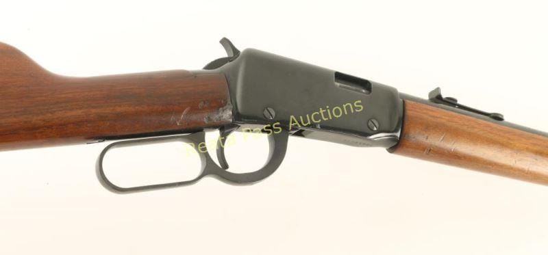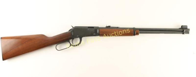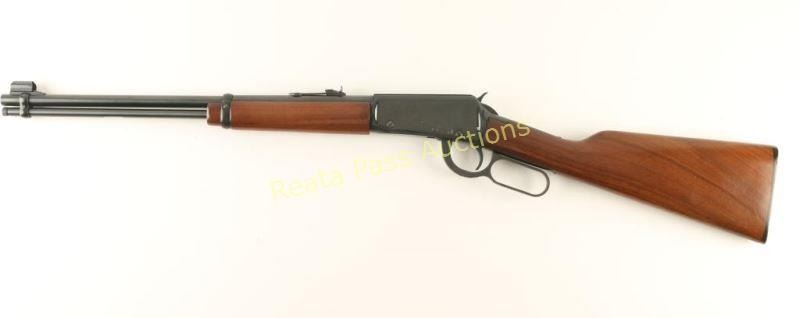German made lever action repeating rifle chambered in .22 Long Rifle, produced by Erma 1973-1979. Features a blued 18.5" barrel, full length tube magazine, ramped & hooded blade front sight, adjustable rear sporting sight, serrated hammer spur & trigger, black finished receiver with integral scope rail, smooth walnut forend and straight grip shoulder stock with black hard rubber buttplate. Rifle exhibits approximately 85% of it's original finish showing scattered light surface rust on the barrel and scratches & flaking on the receiver. Action is smooth, bore is pristine and wood stocks are near fine with a few blemishes on the right side. Condition is good++. ***Modern Firearm***