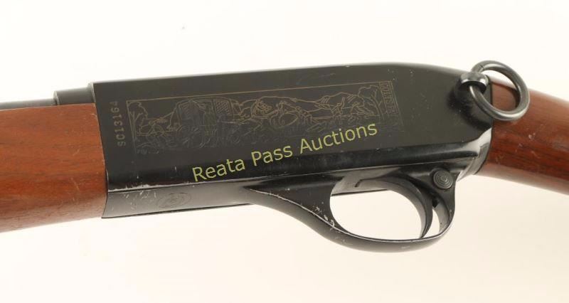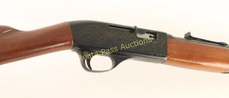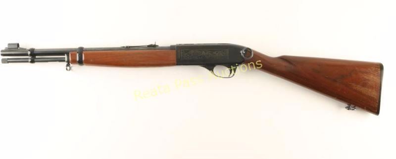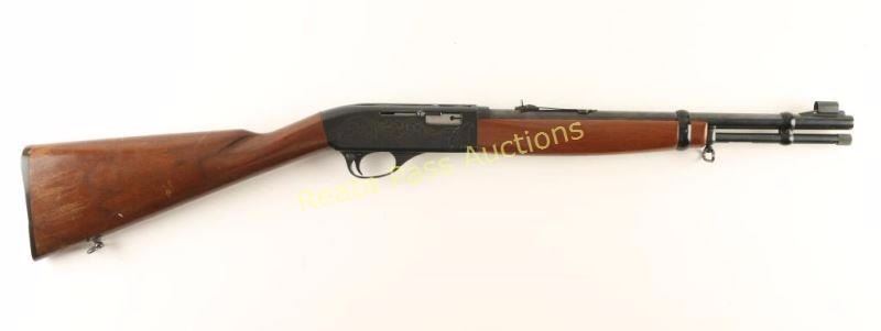 'SRC' Tube fed semi-automatic rifle chambered in .22 Long Rifle, circa 1965-1975. Features a black finish, 16.5" barrel, full length 13 round tube magazine, ramped & hooded blade front sight, adjustable rear sporting sight, smooth trigger, push button safety, serrated charging handle, saddle ring, roll stamped stagecoach holdup scene on receiver, sling swivels, smooth walnut forend and straight grip shoulder stock with factory buttplate. Rifle exhibits approximately 89% of it's original finish showing a few specs of light surface rust on the barrel and several small losses on the receiver. Action is smooth, bore is pristine and wood stocks are very good+ showing scrapes & finish loss. Condition is very good. ***Modern Firearm***