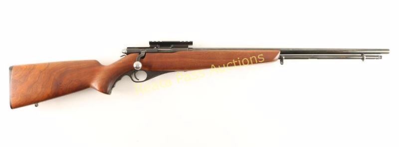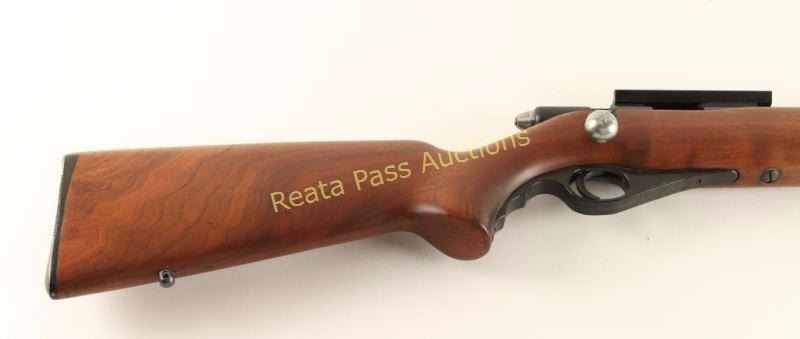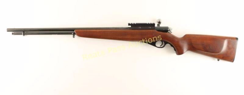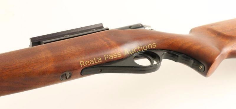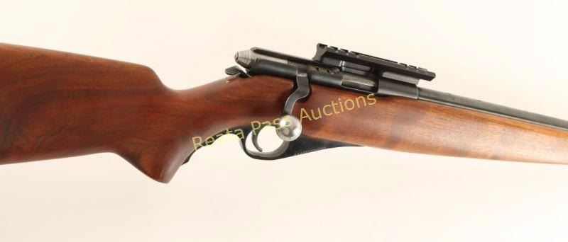 Tube-fed bolt action sporting rifle chambered for .22 Short, Long or Long Rifle, circa 1940's - 1950's. Features a blued finish, 23.25" barrel, full tube magazine, removed sights, side mounted scope rail, serrated trigger, bent bolt handle, no dust cover, manual safety, swivel studs, black plastic trigger guard with finger grooves, and one piece smooth walnut pistol grip shoulder stock with cheek rest. Rifle retains approximately 78% of it's blued finish with areas of wear turning to a brown patina. Action is smooth, bore is very good and wood stock is fine. Condition is good to very good. ***Modern Firearm*** ***C&R Firearm***