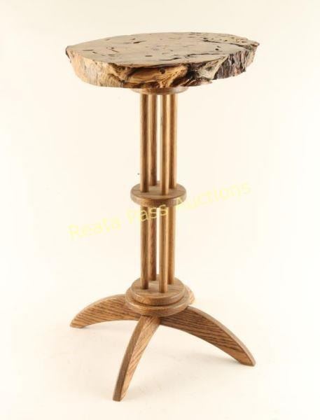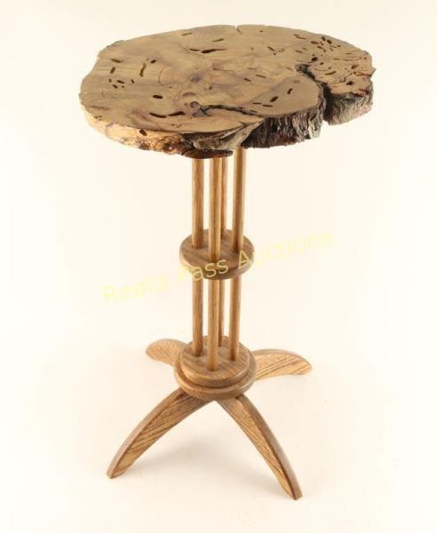 with Oak base made by local artisan. Table measures 14" in diameter and stands 23 1/2" high.