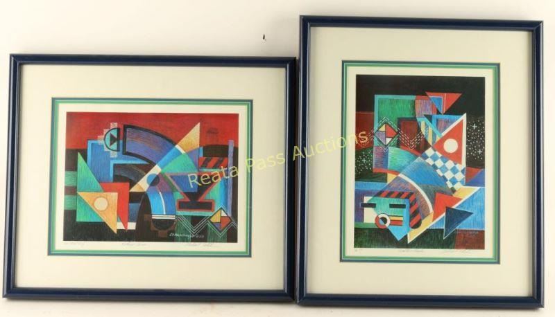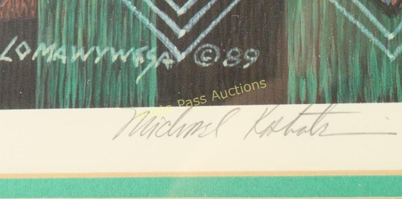 William Kabotie artist, 1 print entitled "Geometric Clouds" and the other entitled "Kachina Forms", both are signed with triple mats and blue frames. Measure 12"x9".