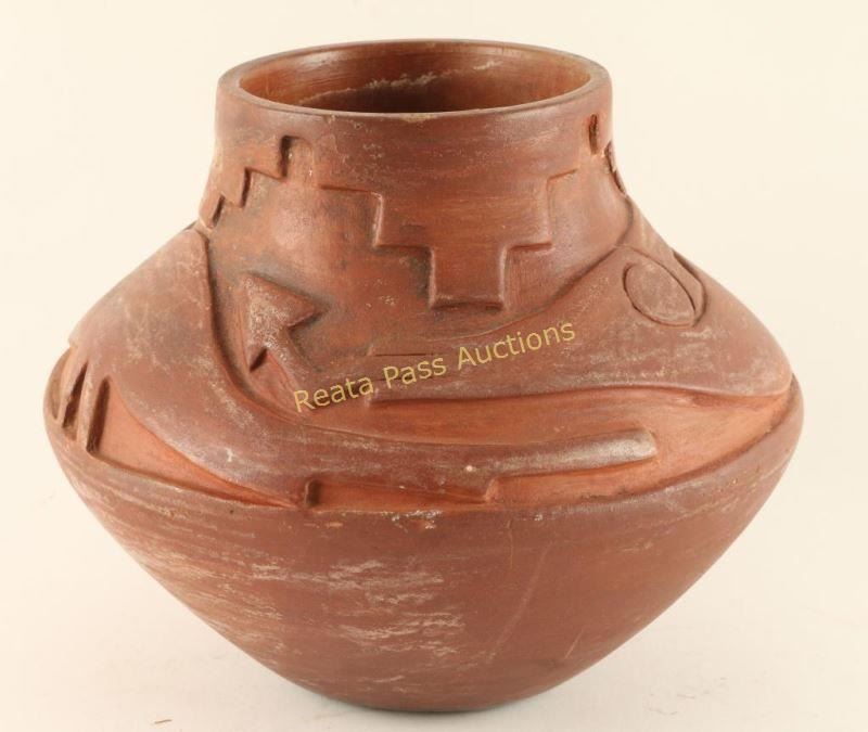 Incised carved with a serpent and geometric pattern 8"h x 11"w. Bottom has a black painted circle. Condition is very good overall with only a minor chip to rim.