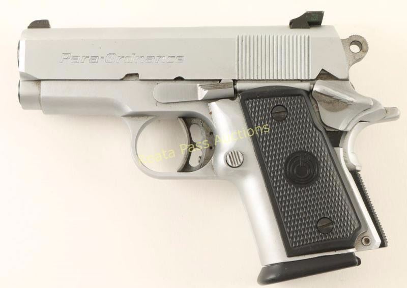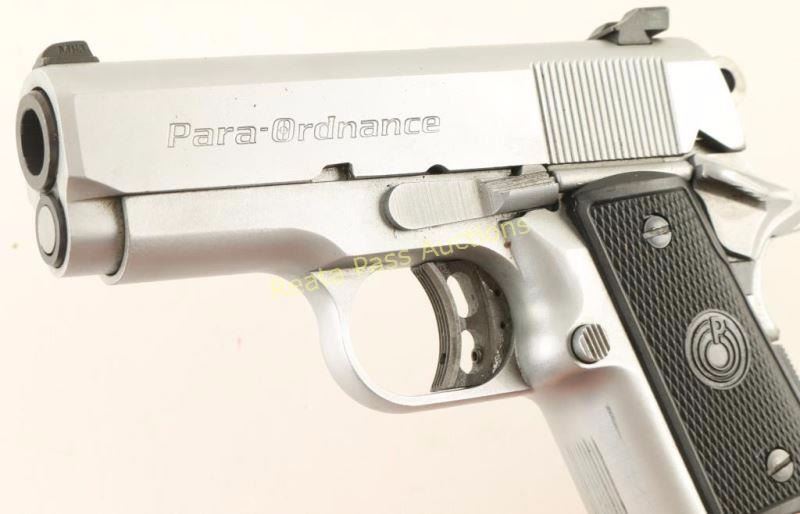 Canadian made compact 1911 style semi-automatic pistol chambered in .45 Automatic. Features a satin silver finish, 3" barrel, three-dot Tru Dot sights, partially serrated slide, wide grip, 10 round double stack magazine, thumb safety, beavertail grip safety, adjustable trigger, serrated round hammer spur, checkered main spring housing and two-piece Para Ordnance black checkered plastic grips. Pistol shows only light handling marks with no major wear observed. Action is crisp, bore is excellent and grips are fine. Condition is excellent. ***Modern Firearm***
