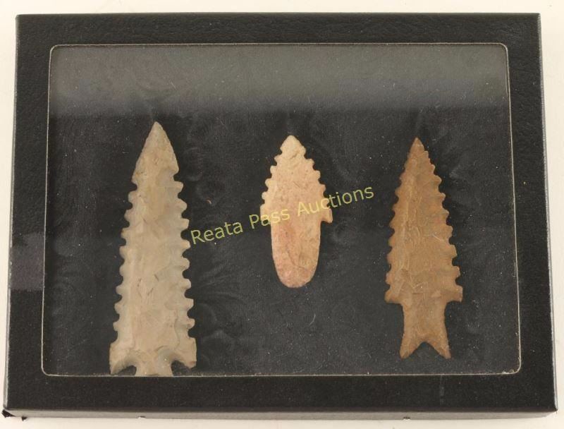 A rare find of 3 stone arrowheads in a Riker case. Unknown age or origin. Offered "as is", we don't guarantee the authenticity of this item, please do your research. All sales are final.