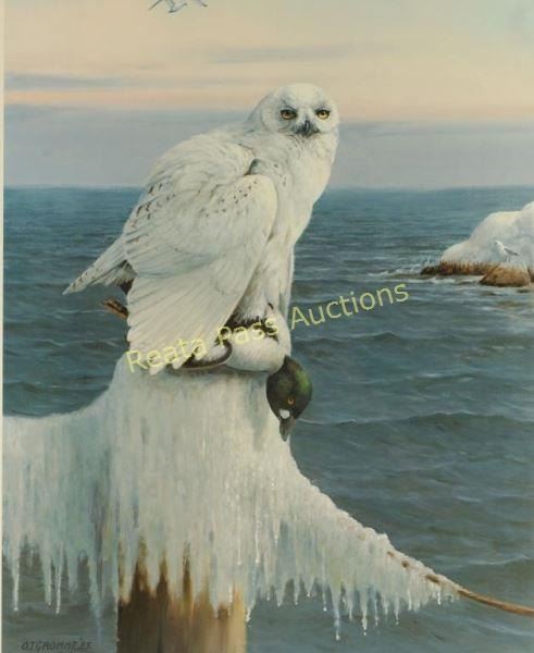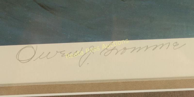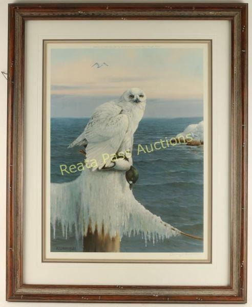"Wintertime-Snowy Owl" by Owen Gromme 367/800, hand signed lower right. Image measures 19"x25" with triple mat, v-groove and wood frame.