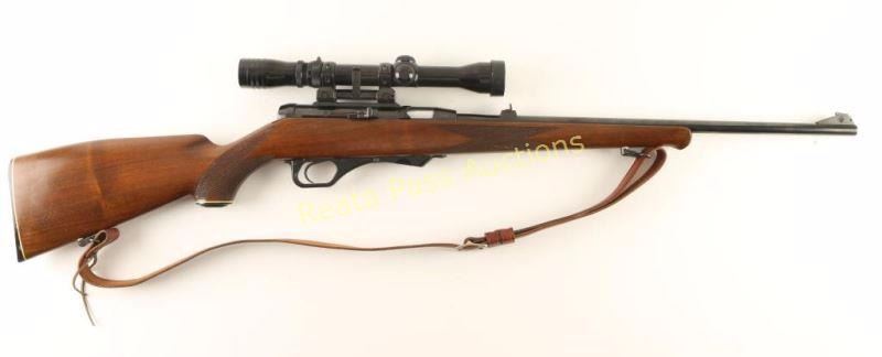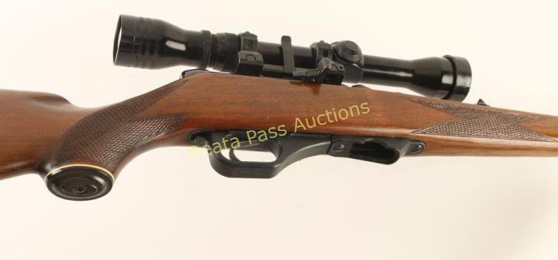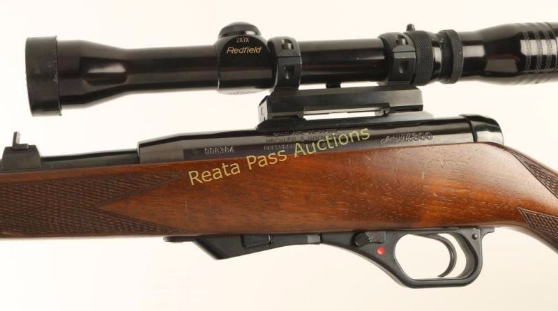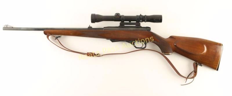 German made magazine fed semi-automatic sporting rifle chambered in .22 Magnum. Imported by Saco of Arlington, V.A. with import marks on the receiver. Features a blued finish, 19 3/4" barrel, ramped blade front sight, raised rear window sight, Redfield 2-7x scope on quick detach mount, manual safety, serrated trigger, no magazine, smooth brown leather sling, serrated charging handle and one-piece checkered walnut pistol grip shoulder stock with schnabel forend, cheek rest & factory buttplate. Rifle exhibits approximately 98% of it's original finish showing little wear and the receiver turned to plum. Action is smooth, bore is mirror bright, optics are clear and wood stock is very good with some minor blemishes. Condition is very good++. ***Modern Firearm***