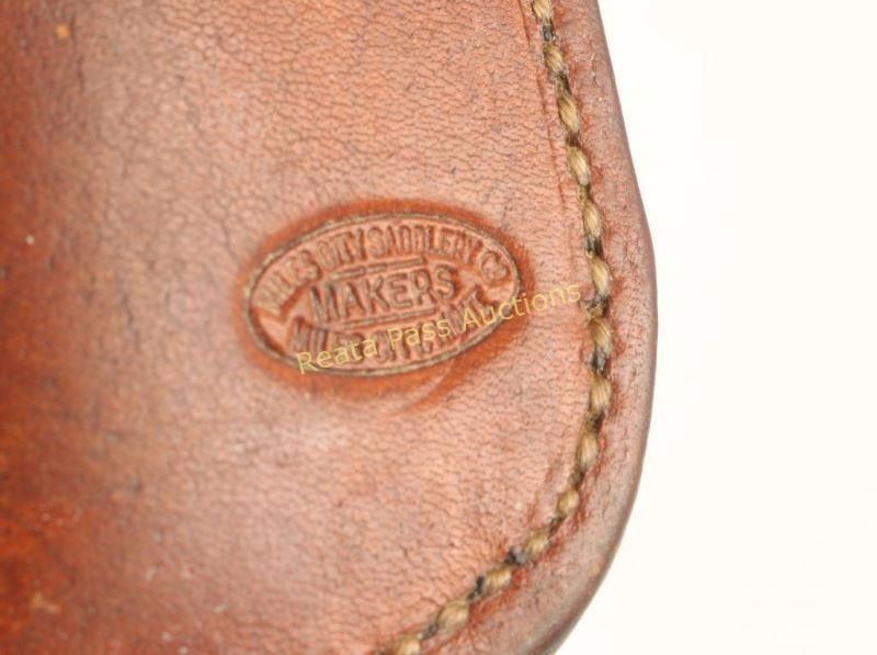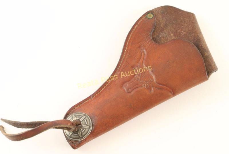 Smooth brown leather belt loop holster with tooled steer head, concho and fringe. Stamped on the rear, "Miles City Saddlery Co./Makers/Miles City, Mont." In overall excellent condition.