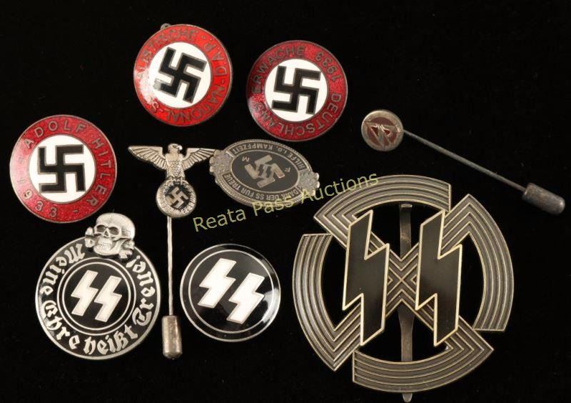 (5) Enameled Lpel Party Pins. Includes SS;SS FM; NSDAP Adolf Hitler 1933; Deutschland Erwache 1933. All are 'RZM' maker marked. The have a thin horizontal pin back. (1) Waffen SS Member Lapel Badge. The front reads 'Meine Ehre heist Treue!'. The reverse side is maker marked 'ges gesch RZM M13/ 42 SS'. Has a thin horizontal pin back. (2) Political Leader Eagle & SA Stick Pins. Both are 'RZM' maker marked. Nickel construction with enamel. (1) Waffen SS Bronze Runic Breast Badge. Measures 2" in diameter. The reverse side is maker marked 'Richard Seiper & Sohne Ludenscheid RZM M1/25' Has a wide vertical pin back. Offered "as is", we don't guarantee the authenticity of this item, please do your research. All sales are final.