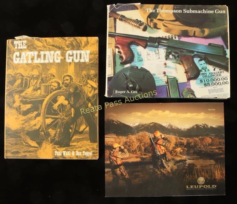 Including; "The Gatling Gun" by Paul Wahl & Don Toppel, and "The Thompson Submachine Gun" by Roger A. Cox Limited Edition #83 and signed by the author, some staining on front and back pages and also some highlighting in first few pages of book. Includes a 2008 Leupold Optics catalog.