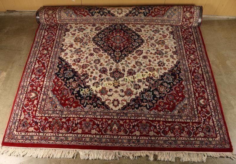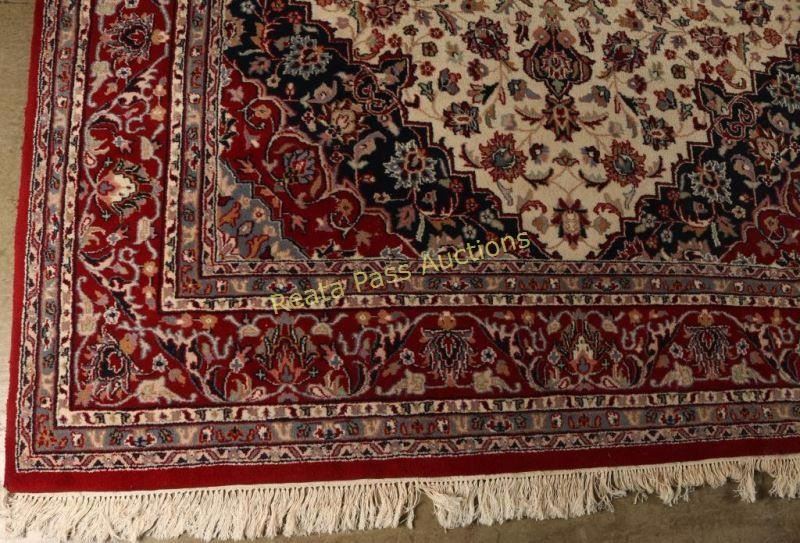Deep red base with blue, cream. Thick wool pile with fringe. Measures 71/2 X 10 Feet