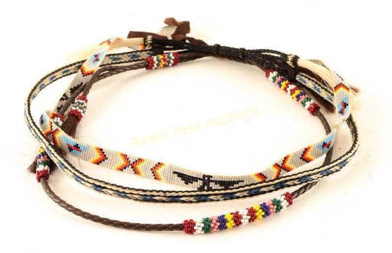1 Beaded Hatband With Thunderbird And Cloud Motif. 1 Bead And Brown Leather Braided Hatband With Horsehair Ends. 1 Black, White, And Blue Braided Horsehair Hatband.