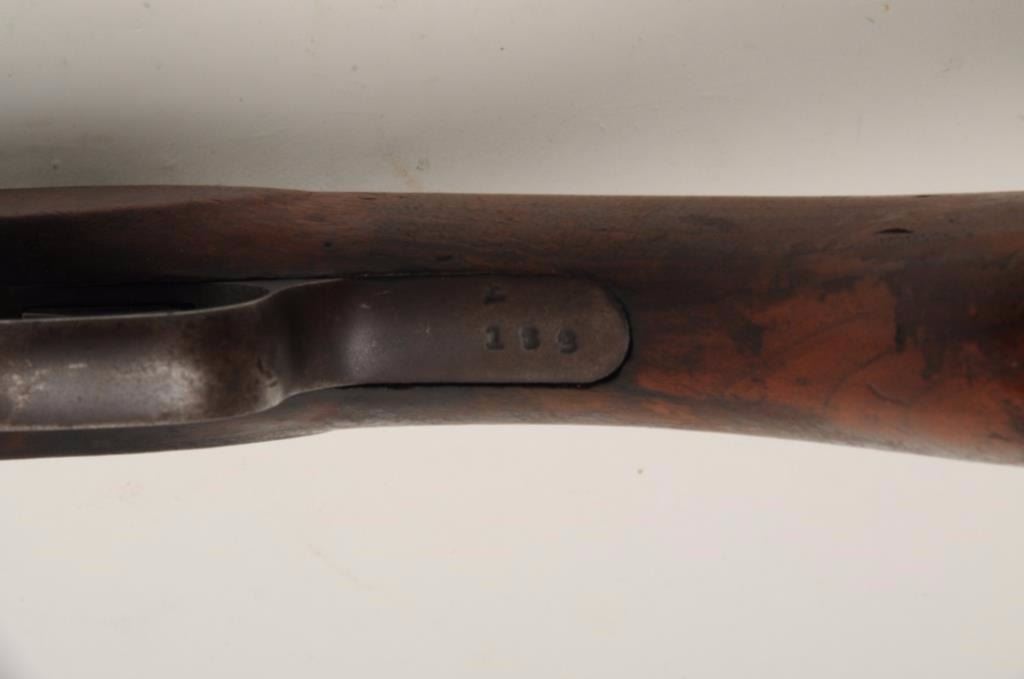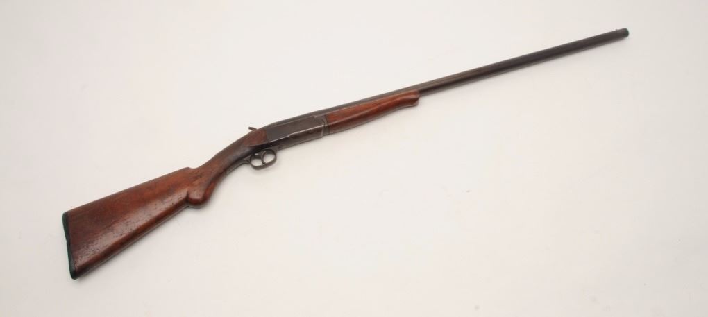 Stevens single barrel shotgun, 12 gauge, 30” barrel, wood stocks, S/N E 189, in overall good condition displaying a brown patina to metal surfaces, good action, good bore and stocks that show scattered mars and scratches from carry and storage and a small old chip to the butt stock behind the upper tang; correct Stevens checkered hard rubber butt plate. (Modern/PPT). Est.: $50-$100.