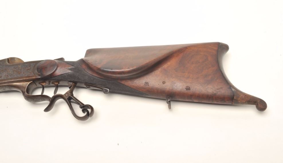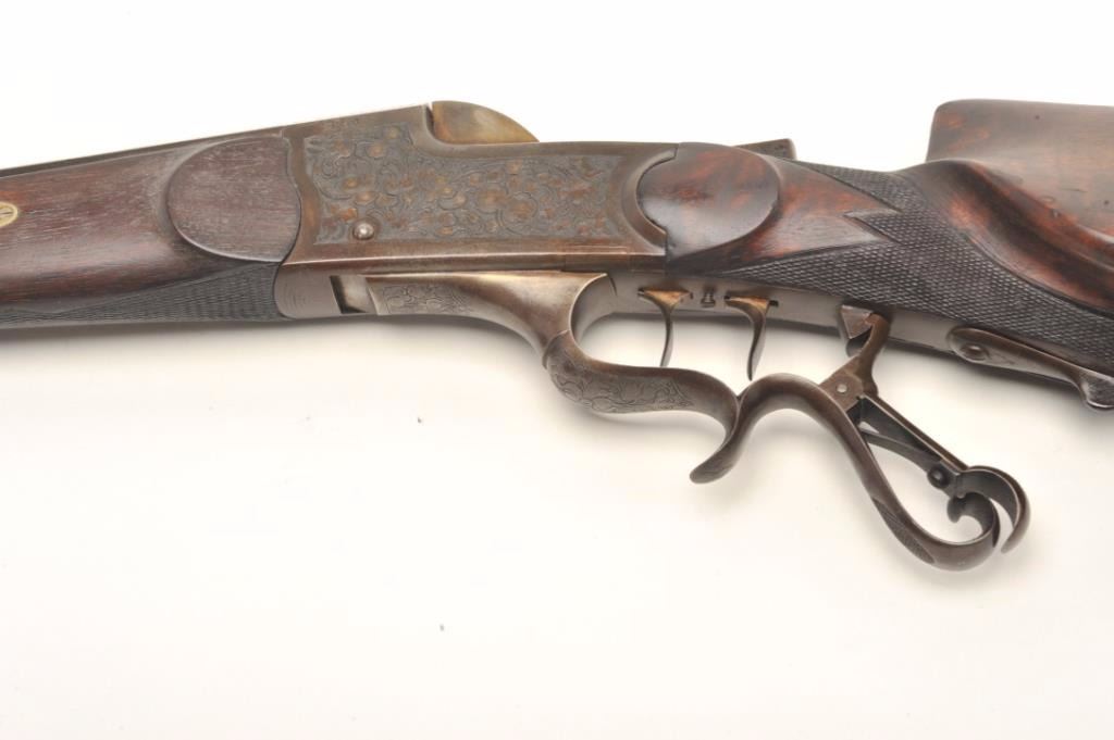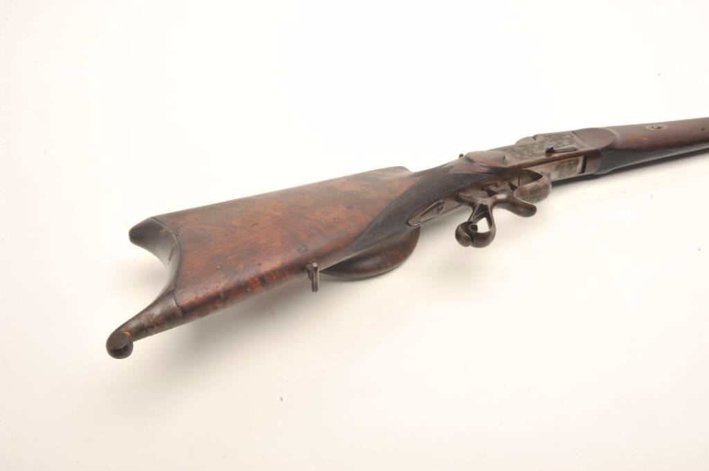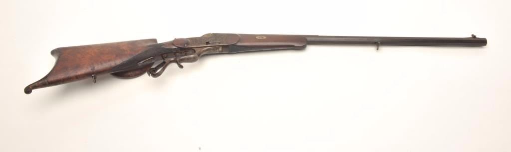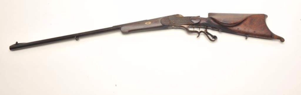 German Schutzen Target single shot rifle, approximately 8mm, serial #NSNV. The rifle is in very good overall condition with a 30” octagon barrel. The barrel is going to a pleasing brown patina with a ramp frontsight. The receiver is heavily engraved in the Germanic pattern with darkened, muted case coloring. The tang sight aperture is missing and the action is marked, “DRGM SYST. TANNER” at the front ring. The riflefeatures a unique style of trigger guard with double set triggers. The finely checkered wood target stock is in good condition with numerous small mars and compressions. The butt ends with an engraved target iron buttplate with light surface rust evident. The bore is dark, the action functions and the markings are legible. Est.: $400-$600. (C+R).
