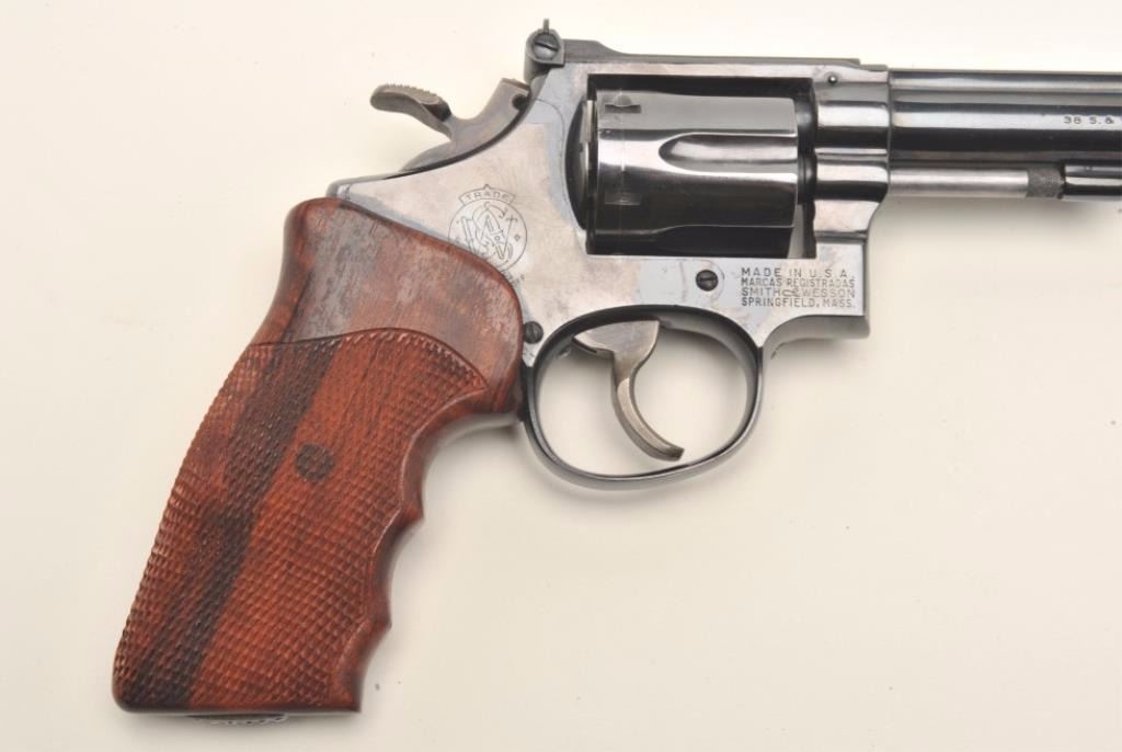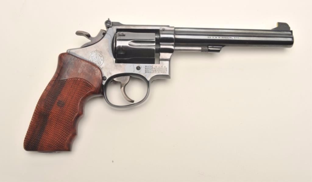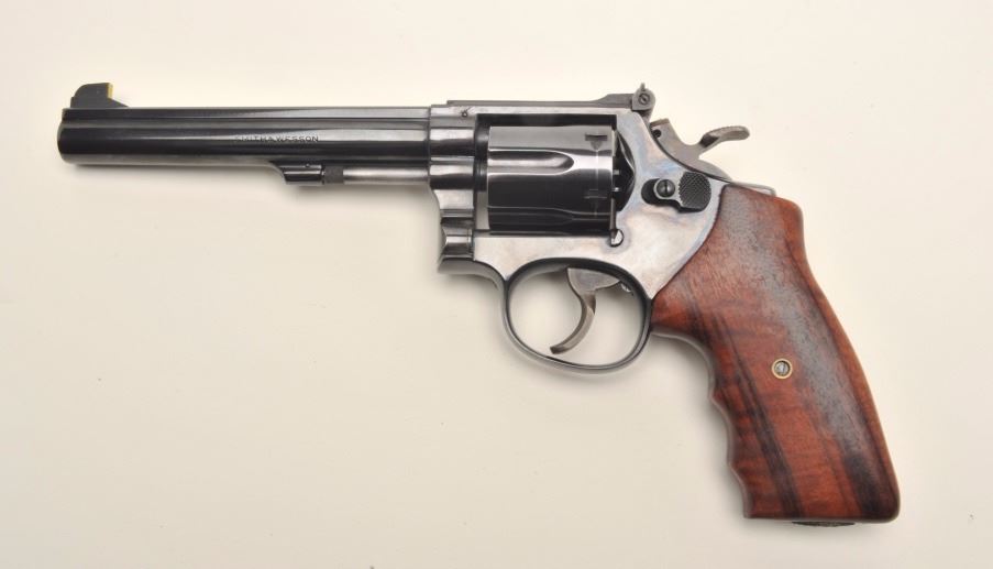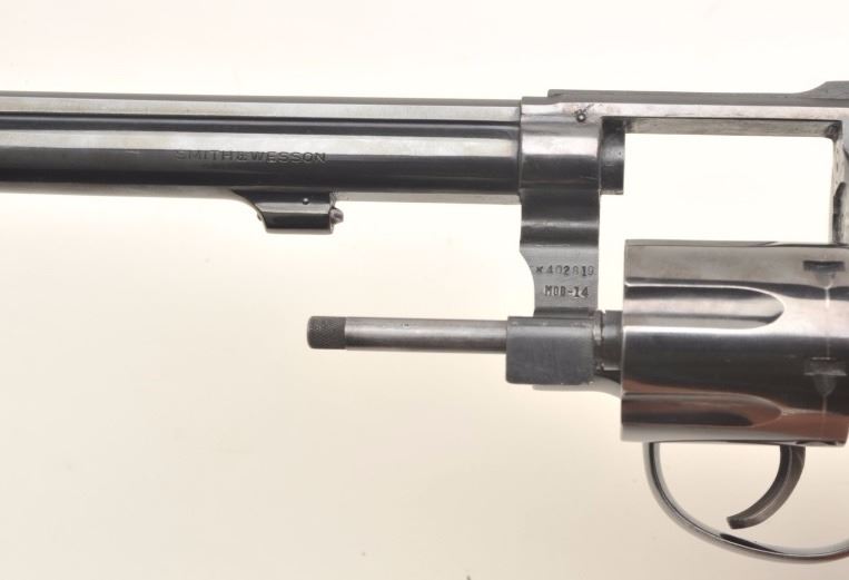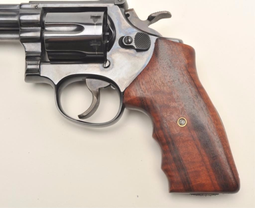 Smith & Wesson Model 14 DA 4-screw frame revolver, .38 Special caliber, 6” barrel, blued finish, target hammer and trigger, custom hardwood finger groove grips, S/N K 402819, in overall fine condition displayingthe majority of its original finish, crisp action, sharp markings, fine bore, very good + custom grips. (Modern/PPT). Est.: $500-$1,000.