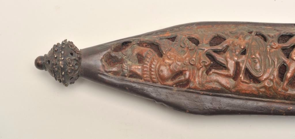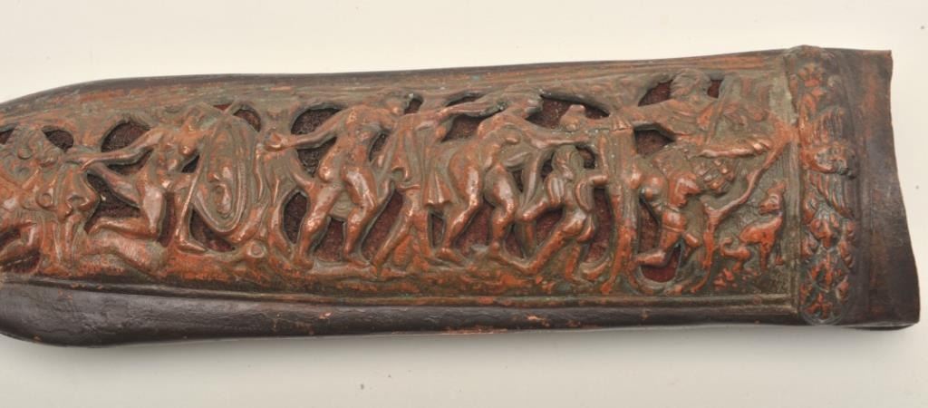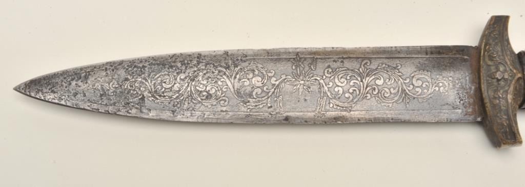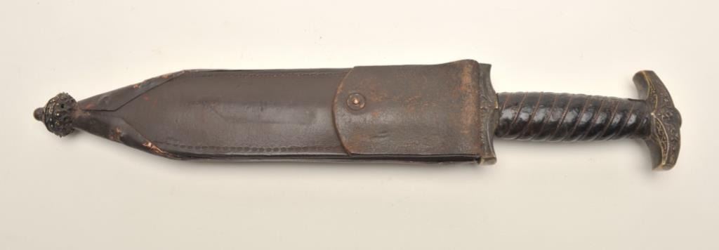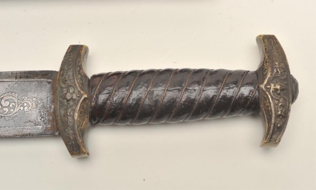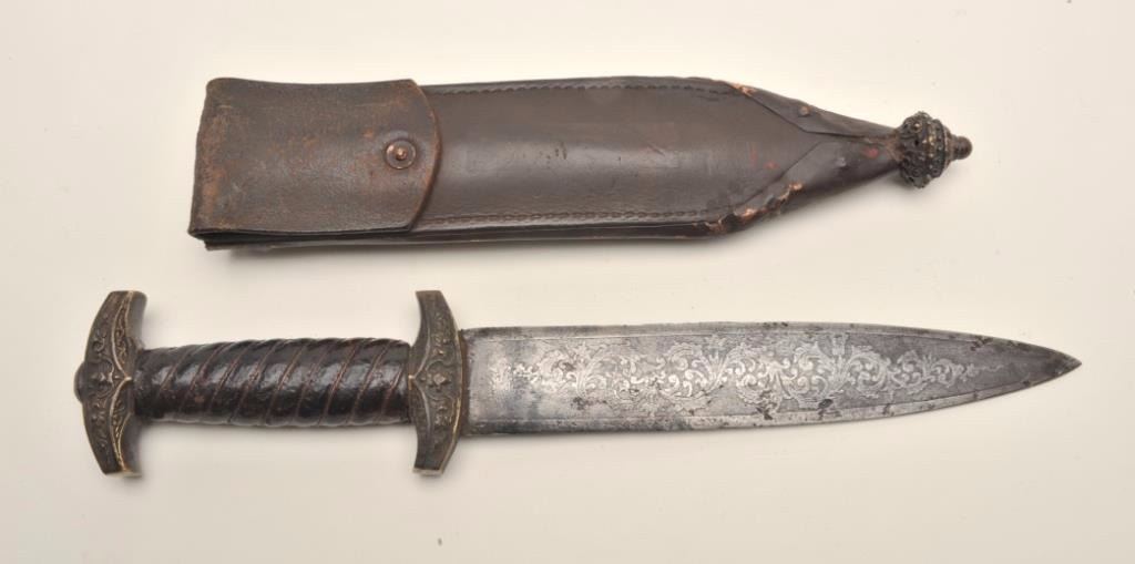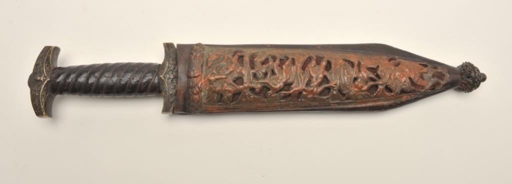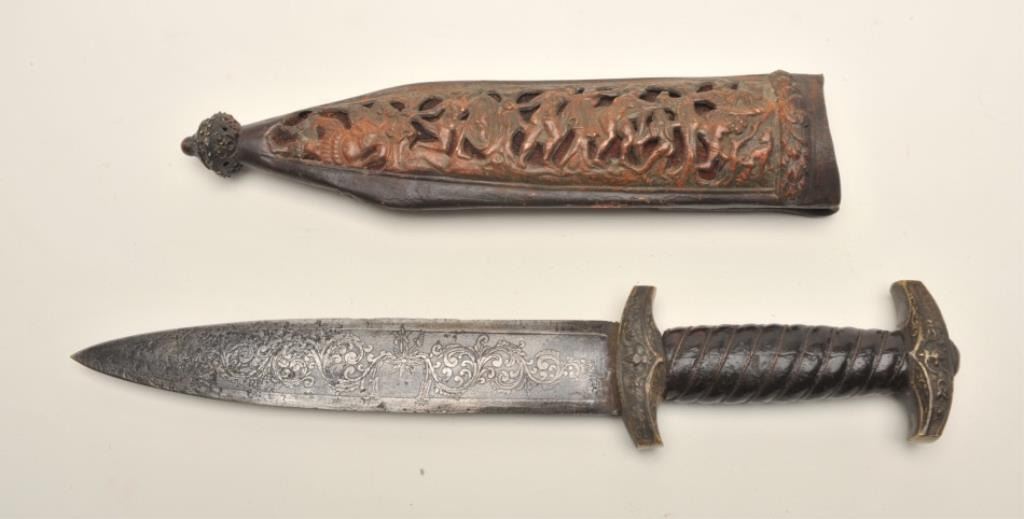Victorian reproduction of a medieval dagger. The dagger is in very good condition with a 9 ½” blade and an overall length of 15”. The blade has taken on a nice dull, grey patina with floral engraving the length of the blade on both sides. The blade has numerous dents and mars from use with some light pitting noted along its length. The handle is wire wrapped leather showings wear and small cracks from age but otherwise in goodcondition. The scabbard is hammered copper over leather and features an intricate scene depicted on the front. A well-made copy of a medieval European dagger. Est.: $500-$1,000.