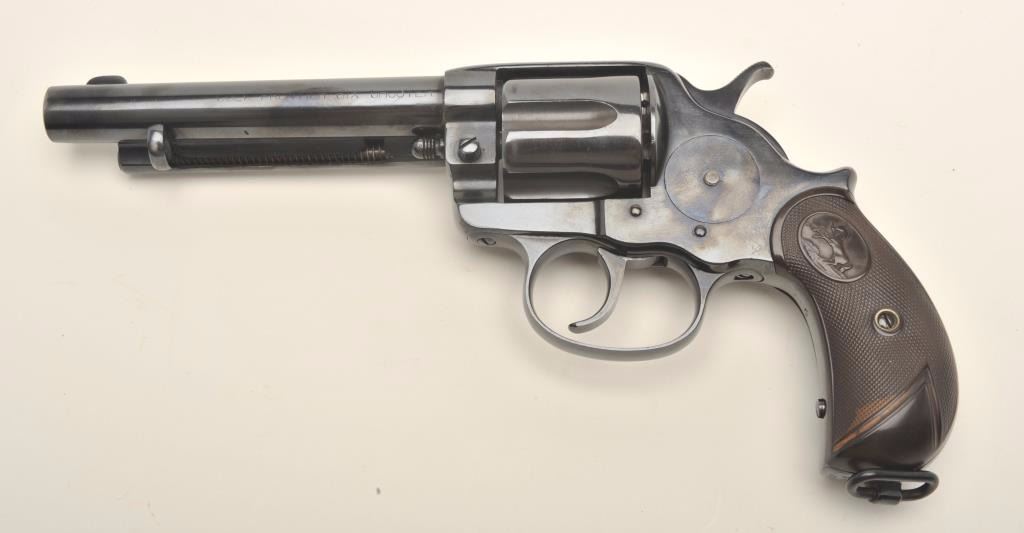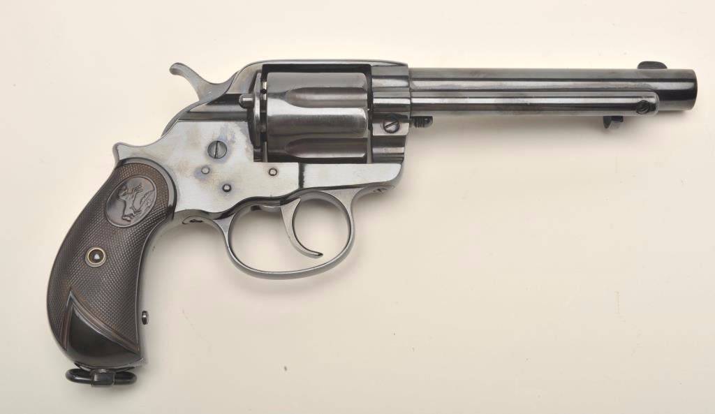 Colt Model 1878 DA revolver, .44-40 caliber, 5.5” barrel, re-blued finish, checkered hard rubber grips, S/N 37406, in overall good condition as restored, displaying the majority of an old re-blue, good action, good grips, visible markings, fair bore. (Antique). Est.: $800-$1,600.