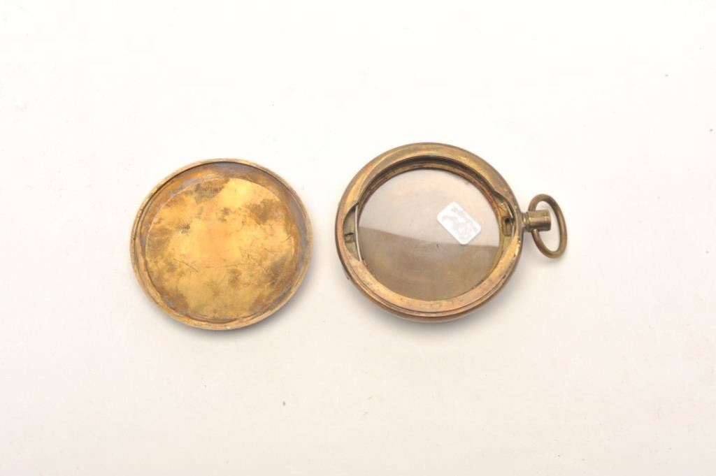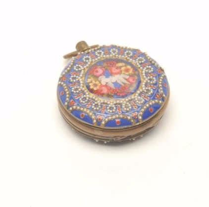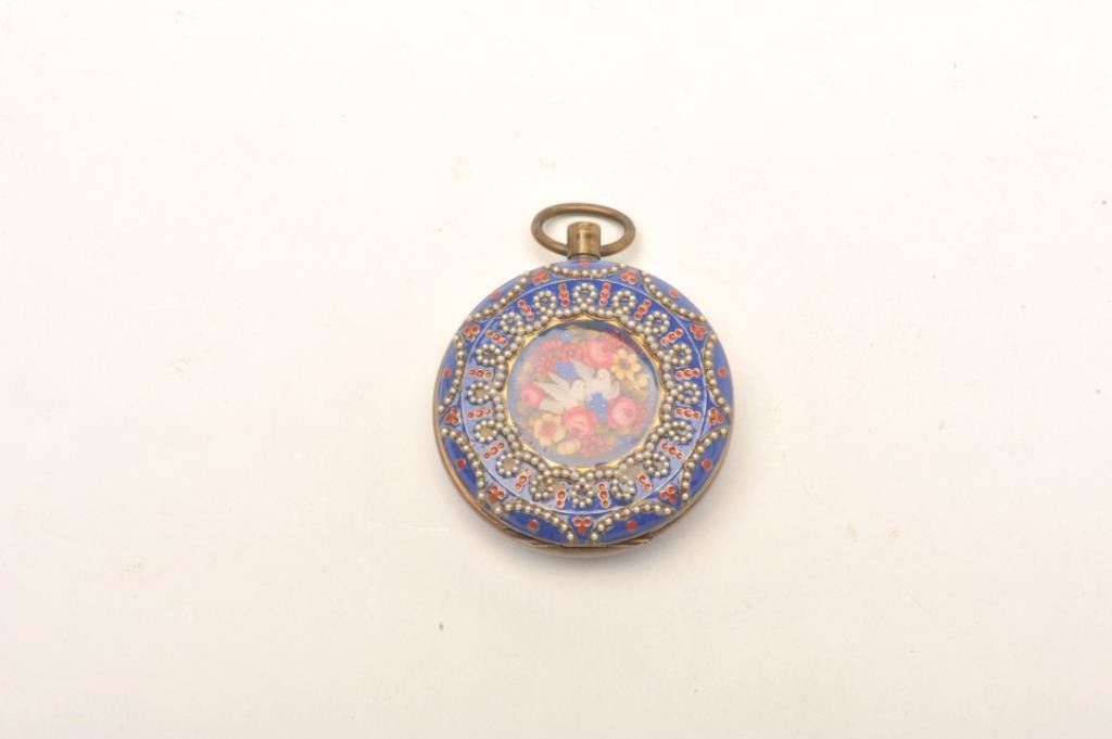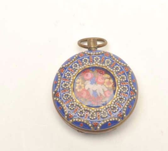 Lot 84 Brass watch case of large size and enameled with seed and pearls circa about turn of the century.