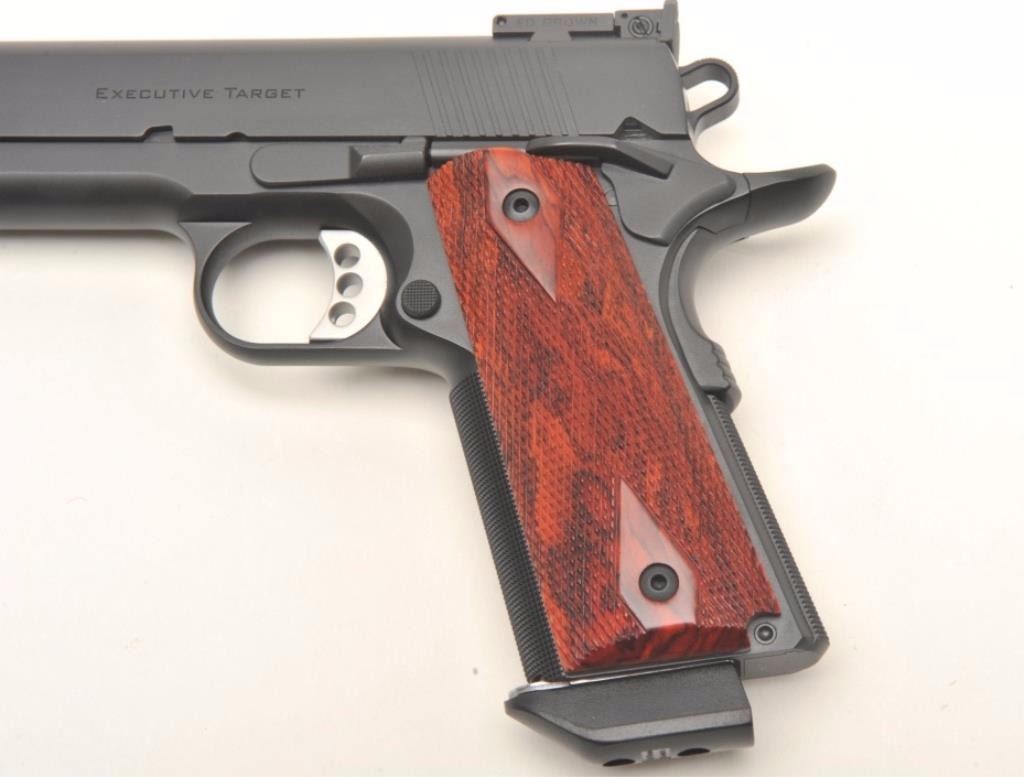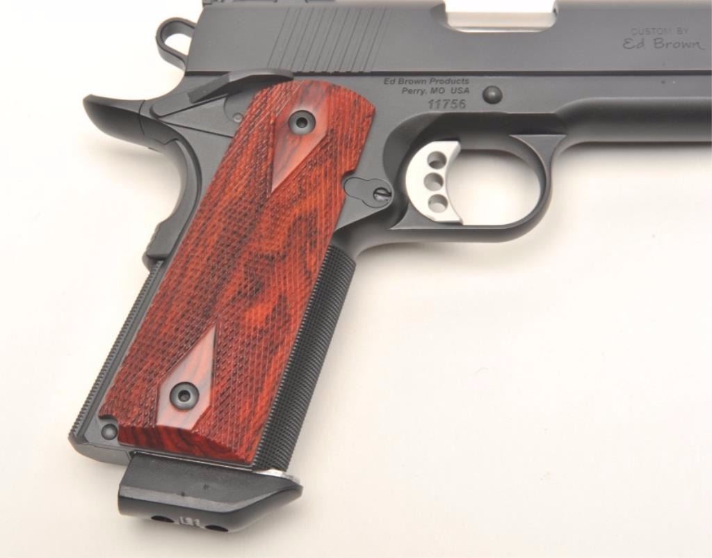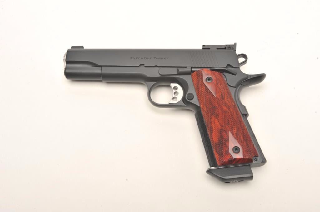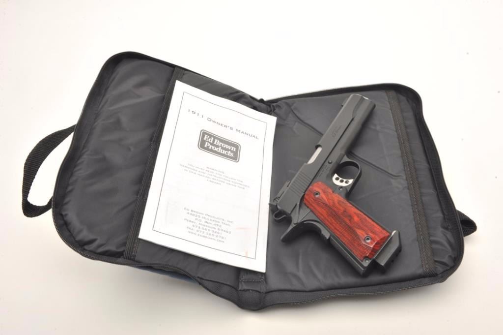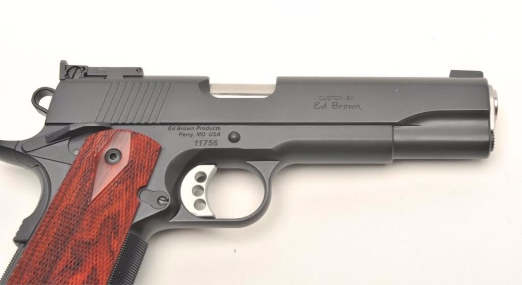 Desireable custom 1911 Executive Target by Ed Brown, .45 ACP pistol, #11756. 5" stainless Bbl, adjustable sights, adjustable trigger, checkered rosewood grips, matte black finish. Pistol is in excellent condition, seeinglittle use. Includes original paperwork, lock and carrybag. Includes one 7 round magazine. Replacement value approximately $3500. Est. $1500-3000. (Modern, PPT)