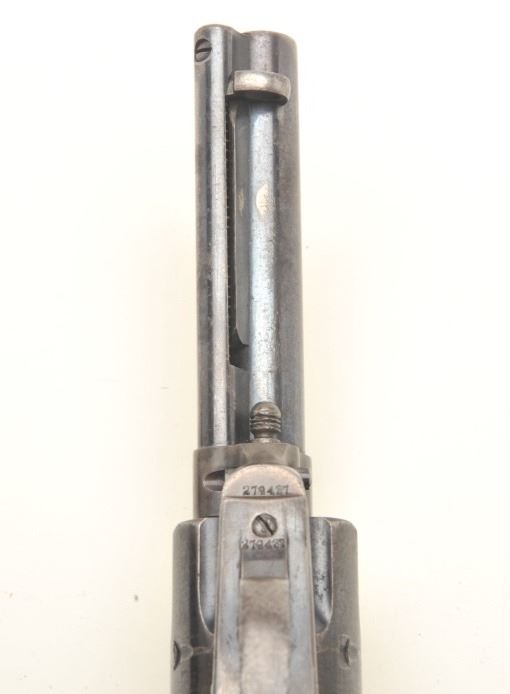 Colt Bisley Model Single Action revolver, .44-40 caliber, 4.75” barrel, blued and case hardened finish, checkered hard rubber grips, S/N 279437, in overall very good to near fine condition showing considerable areas oforiginal blue and scattered areas of original case colors in protected areas of frame with balance gone to a silver tone; crisp action, sharp markings, fine bore and overall very good to near fine grips. (C&R/PPT).Est.: $1,250-$2,500.