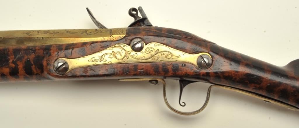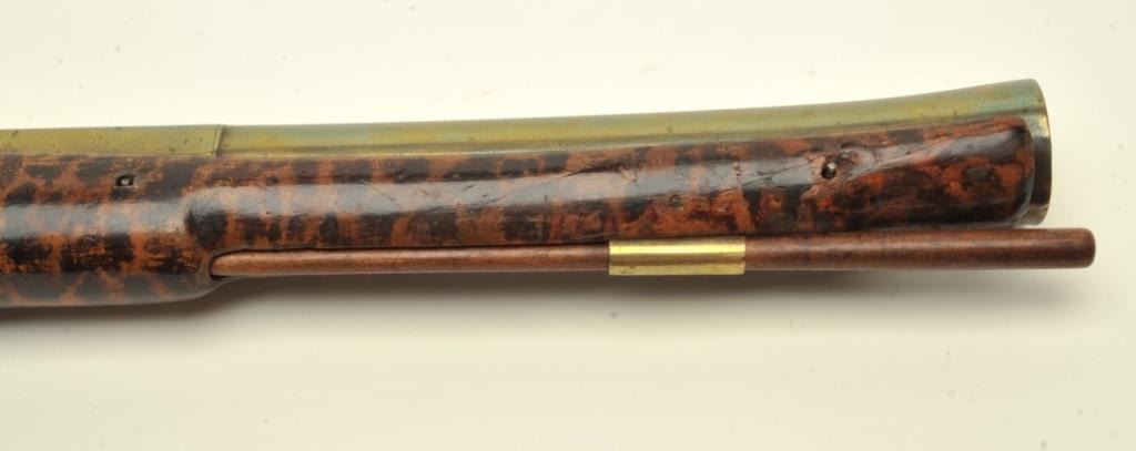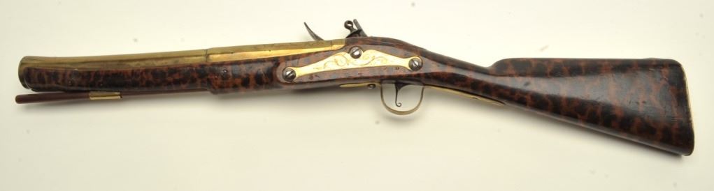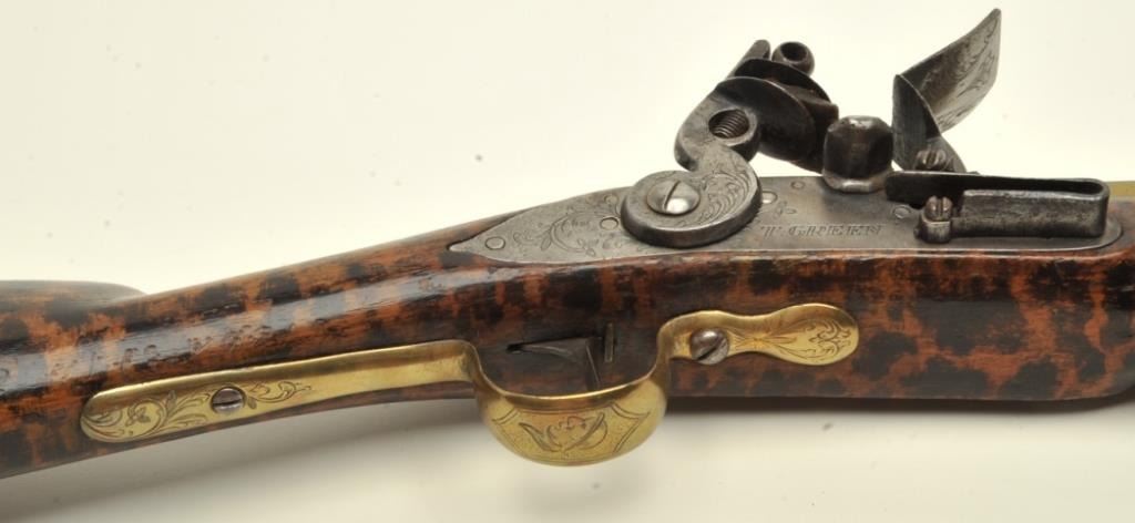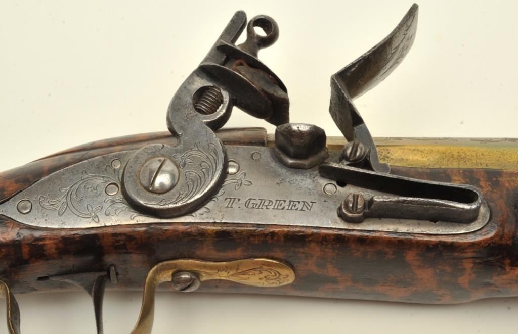 Early 18th century blunderbuss signed “T. Green, Londini. The gun shows 3 screw side plate, flat lock and hammer along with other earlier features which we would place at 1700-1720s. The gun measures 32” overall with 16” two stage heavy and thick walled brass barrel. Very good quality with scroll engraving on the barrel, lock, and mounts. The stock is burnt and stained to simulate the look of tortoise shell. All originalflintlock parts and very good plus overall. A collector’s piece that would appeal to Keith Neal, Clay Bedford, and Knowledgeable collectors! (Antique) Est.: $2750-$5500