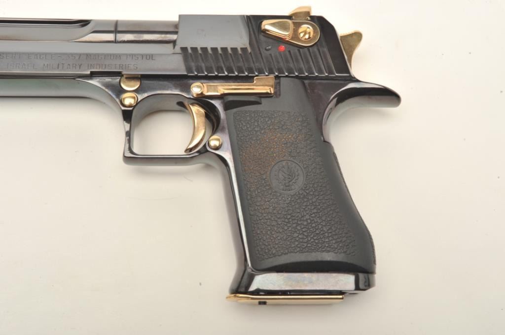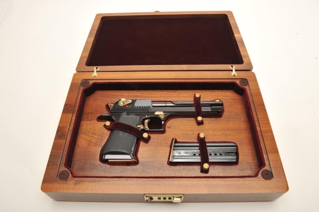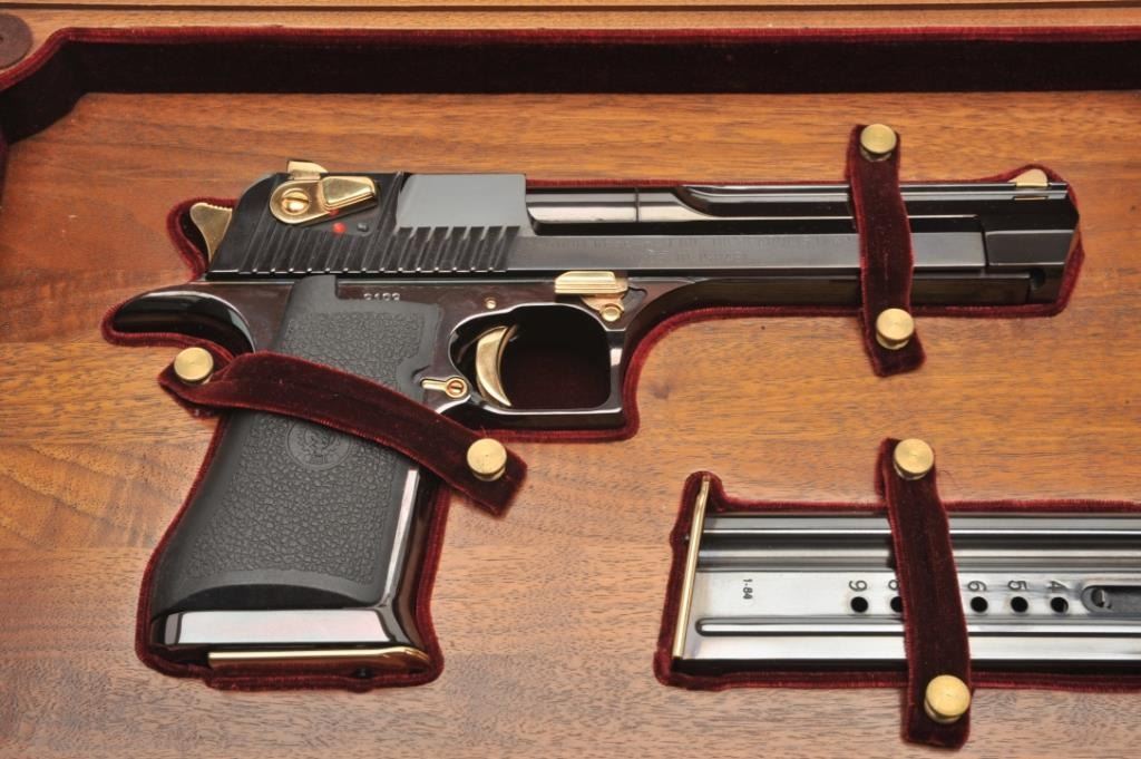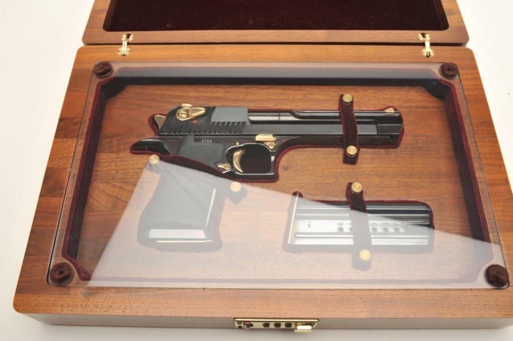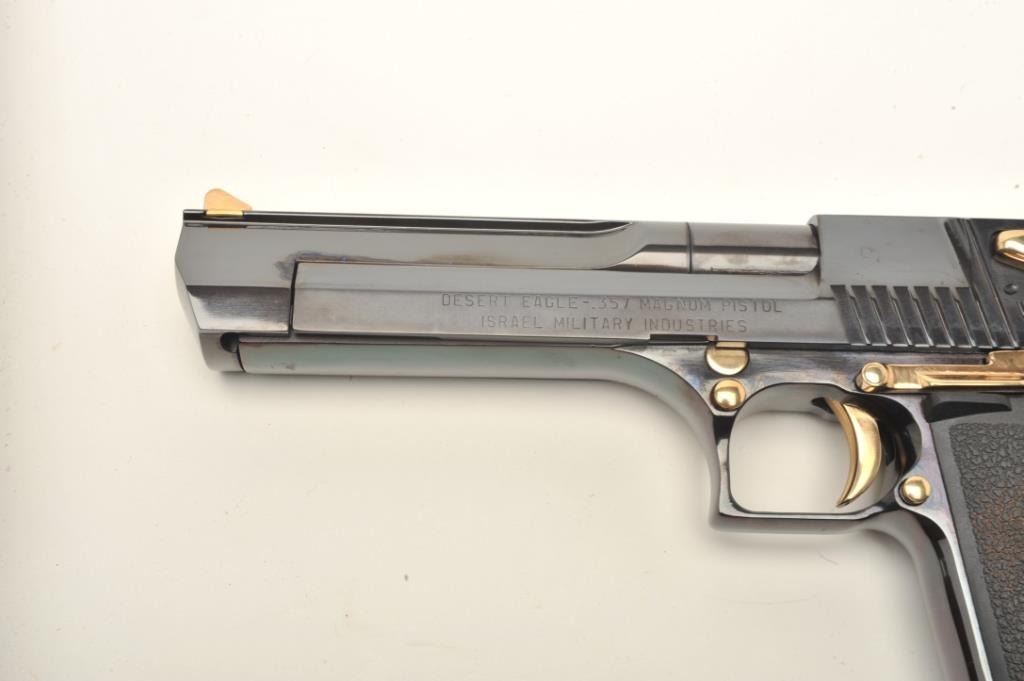 Desert Eagle Presentation semi-automatic pistol, .357 Magnum caliber, 6” barrel, high polish blued finish and 20 ct gold accented small parts, black hard rubber grips, S/N 3193, in like new condition and in a deluxewood presentation case with extra magazine. Very rare. (Modern/PPT). Est.: $3,500-$7,000.