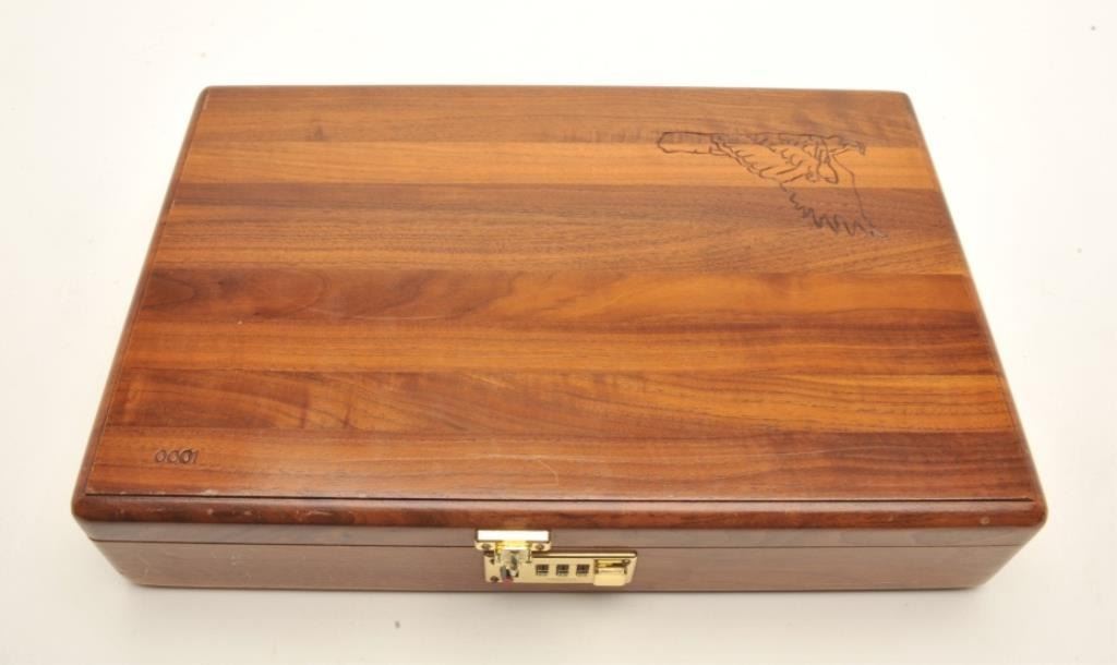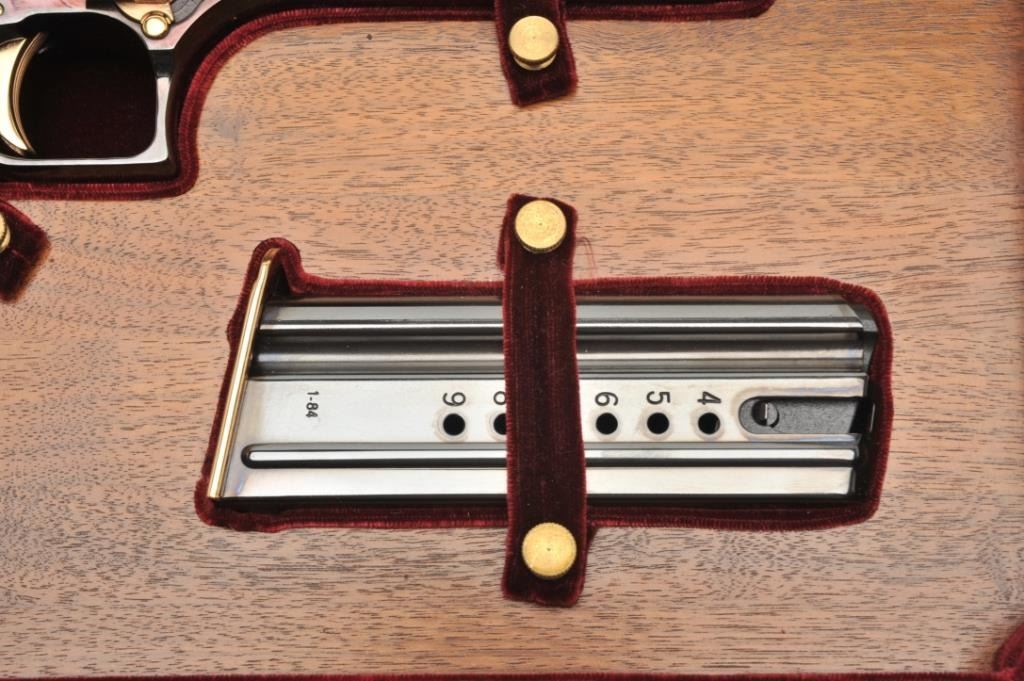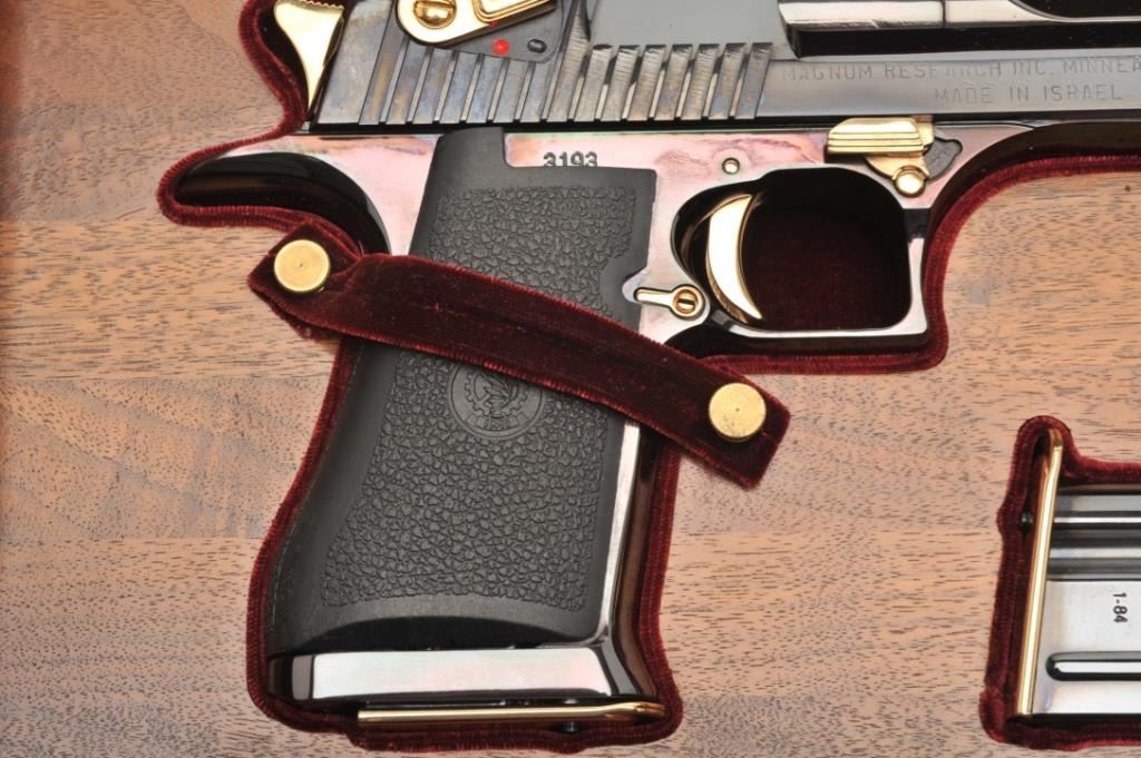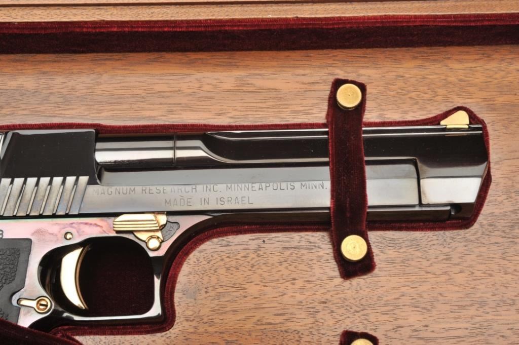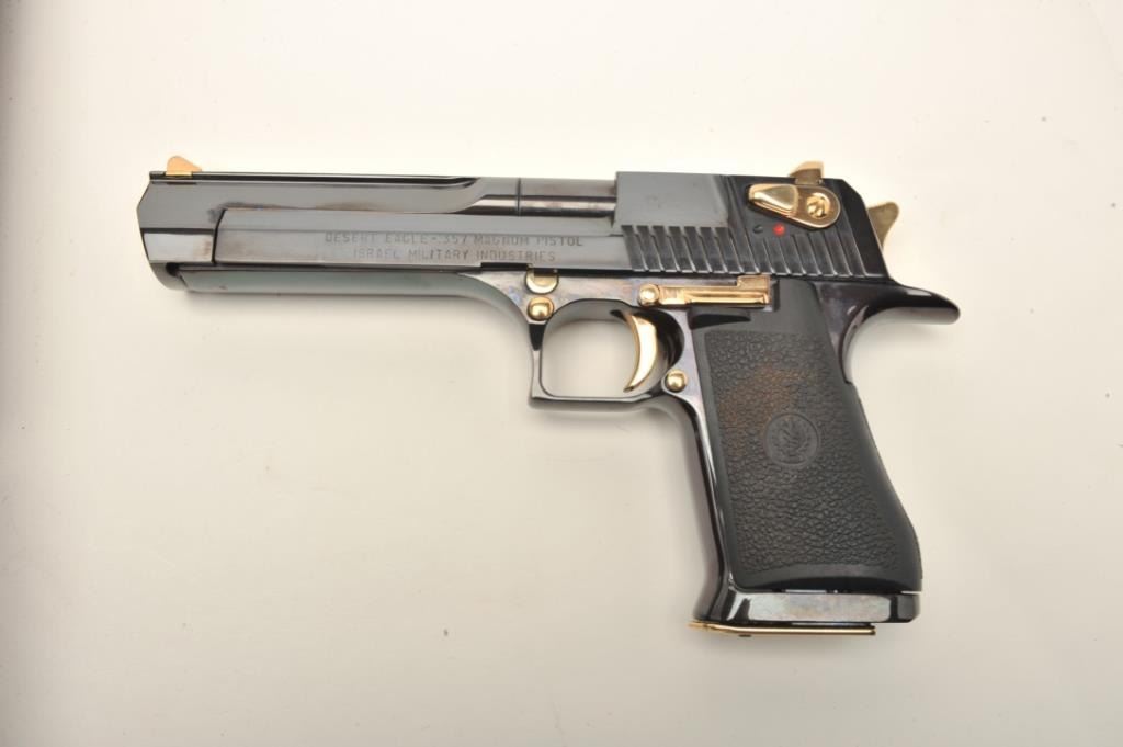 Desert Eagle Presentation semi-automatic pistol, .357 Magnum caliber, 6” barrel, high polish blued finish and 20 ct gold accented small parts, black hard rubber grips, S/N 3193, in like new condition and in a deluxewood presentation case with extra magazine. Very rare. (Modern/PPT). Est.: $3,500-$7,000.