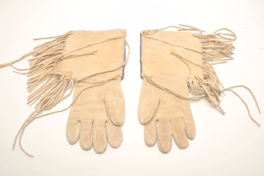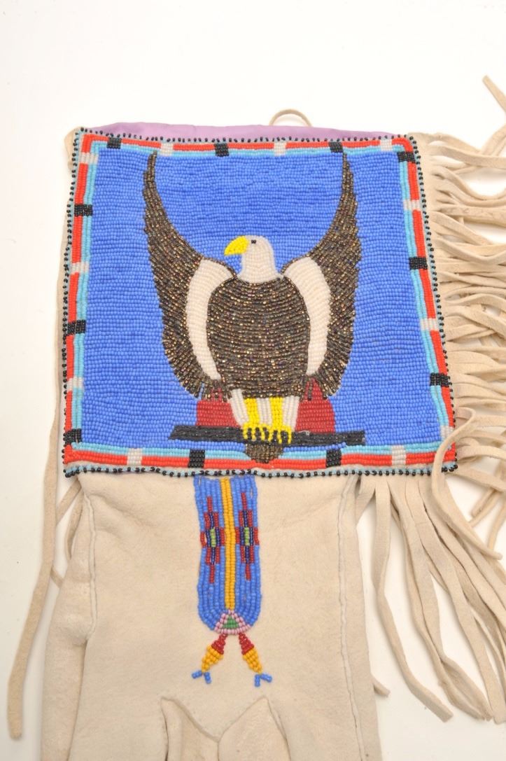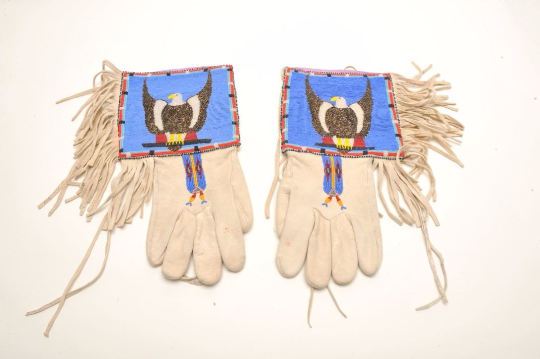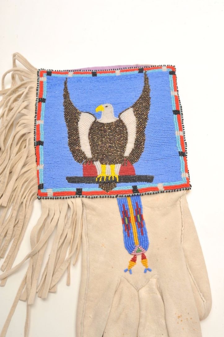 Lot 135 Ca. 1930’s Blackfoot men’s pair of gauntlets with fringes and beaded eagle design; approximately 1