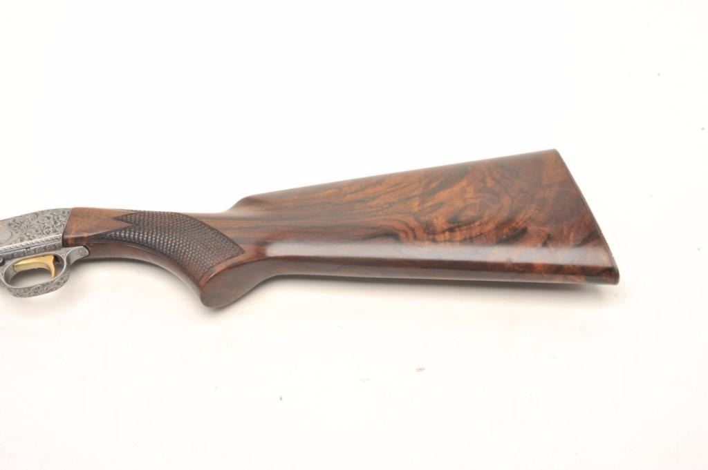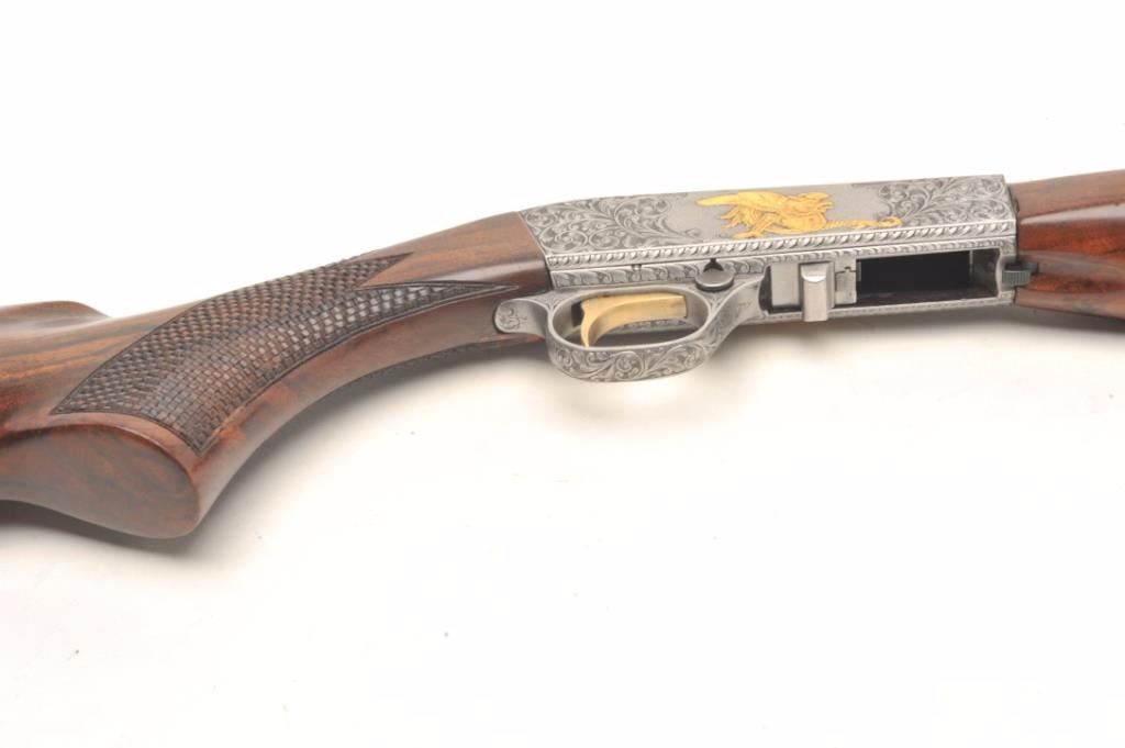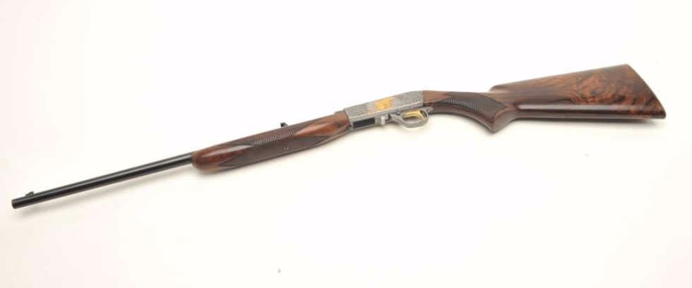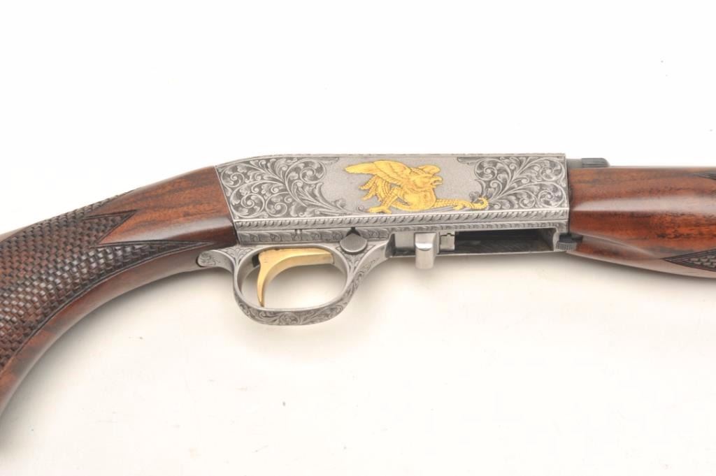 Finely and fully Angelo Bee engraved and gold inlaid gargoyle panel scenes Belgian Browning .22 LR caliber takedown rifle, 19” blued barrel, gold trigger, deluxe checkered finely grained wood stocks, S/N 125647, inoverall excellent condition as outstandingly engraved by Master Engraver Angelo Bee with Certificate of Authenticity signed by Bee and numbered to this gun. A superb work of firearm artistry by one of the best knowncontemporary engravers. (Modern). Est.: $4,000-$8,000.