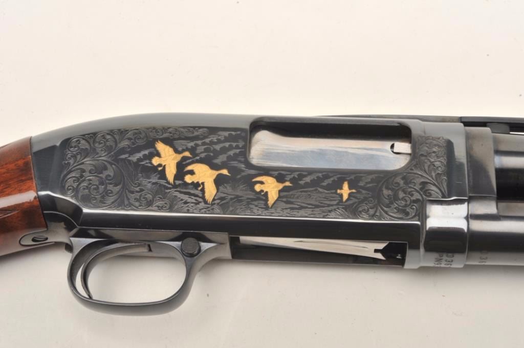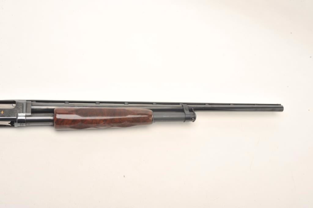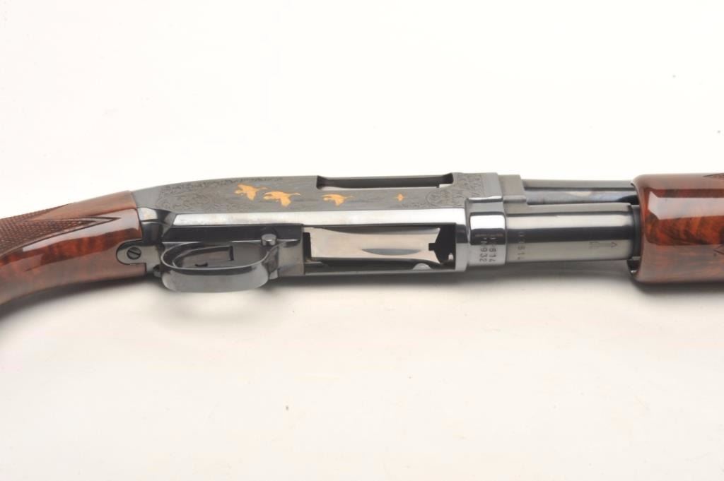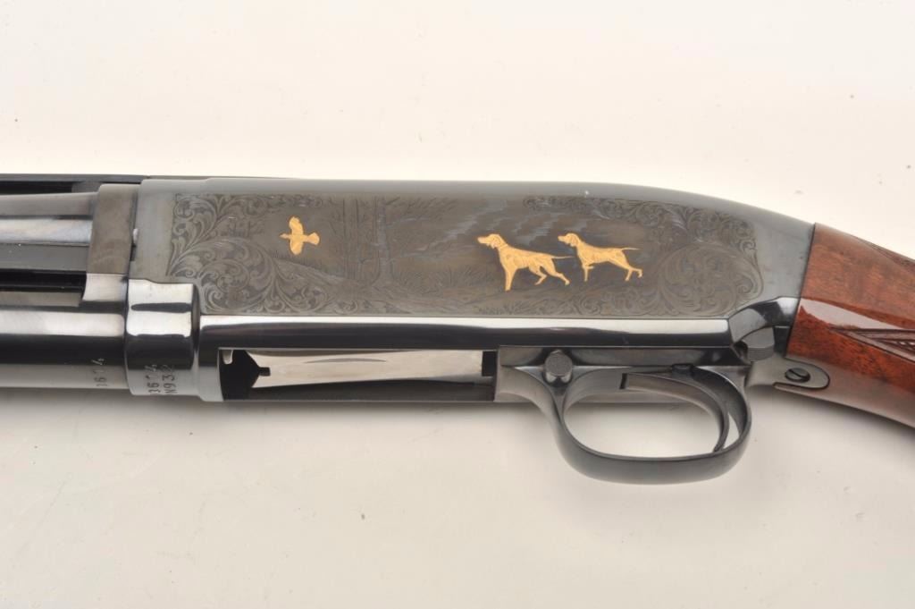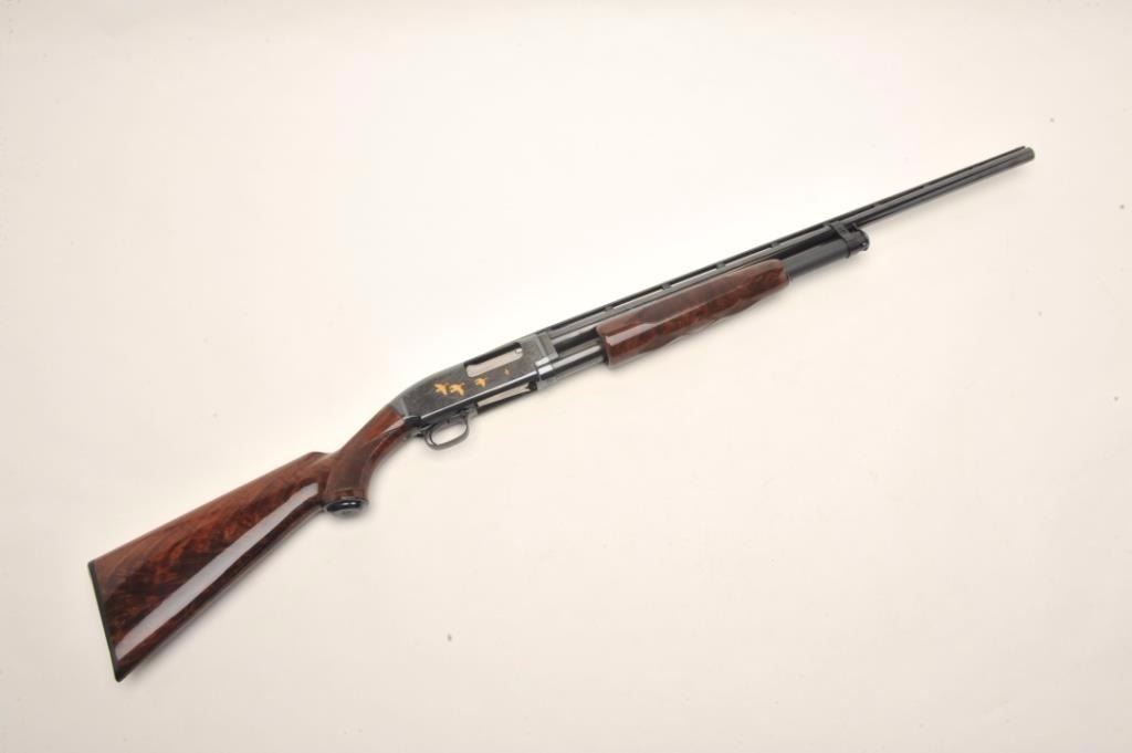 Browning Model 12 High Grade pump shotgun, 20 gauge, serial #03614. The shotgun features 26” barrels with a full-length ventilated rib and steel bead front sight. The barrel retains nearly all of its blued finish withonly the lightest of handling marks. The blued, engraved receiver features gold inlay of game scenes on both sides of the action. The high polish, finely checkered wood stocks are in excellent condition withbeautiful figure, particularly in the butt stock. The butt stock ends with a hard plastic butt plate providing a 14” LOP to a single trigger. The bore is very good, the action crisp and markings are sharp on thismost desirable Japanese made Model 12. Est.: $1,000-$2,000. (Modern).