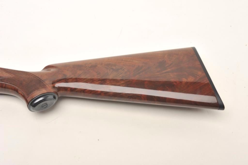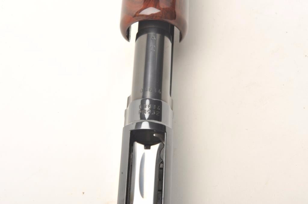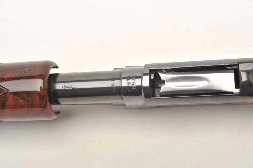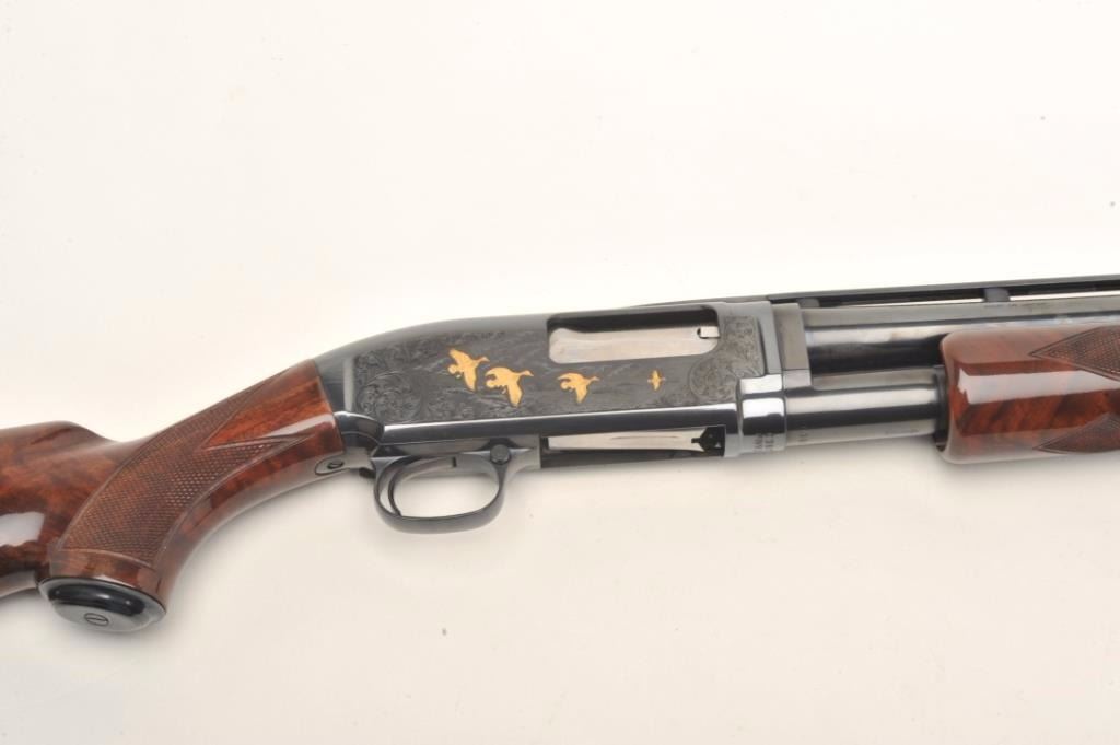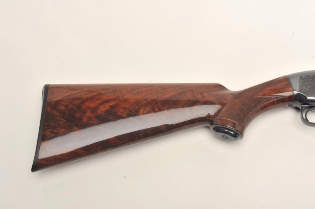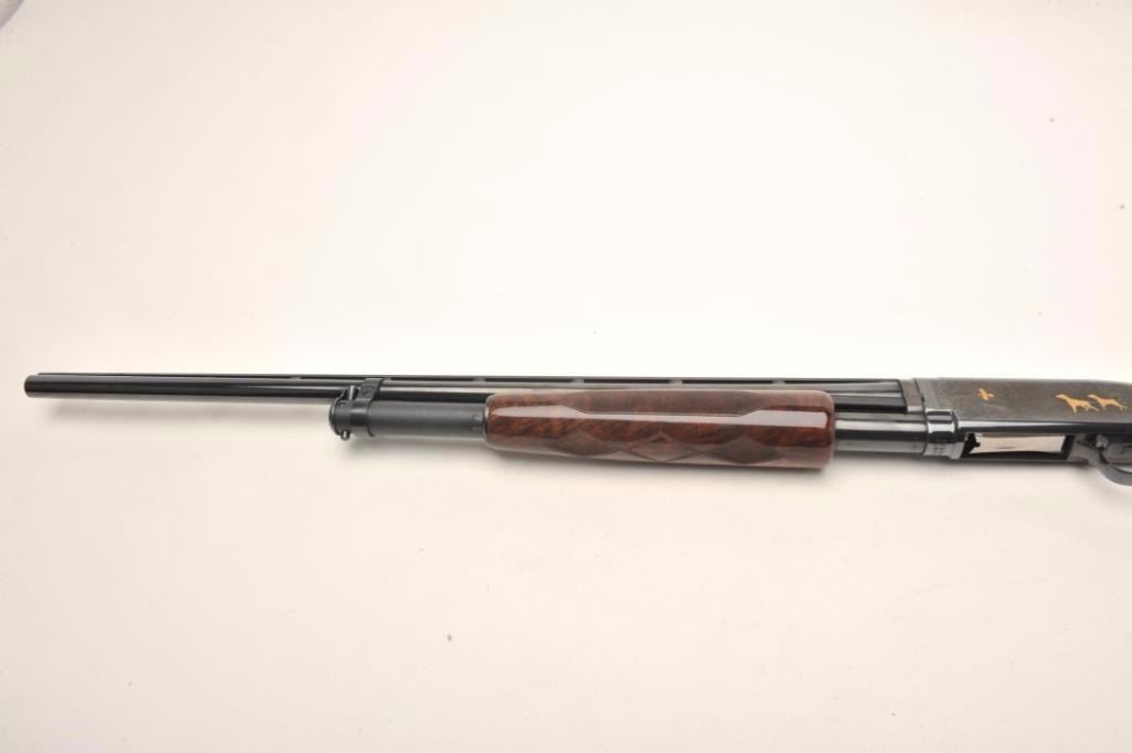 Browning Model 12 High Grade pump shotgun, 20 gauge, serial #03614. The shotgun features 26” barrels with a full-length ventilated rib and steel bead front sight. The barrel retains nearly all of its blued finish withonly the lightest of handling marks. The blued, engraved receiver features gold inlay of game scenes on both sides of the action. The high polish, finely checkered wood stocks are in excellent condition withbeautiful figure, particularly in the butt stock. The butt stock ends with a hard plastic butt plate providing a 14” LOP to a single trigger. The bore is very good, the action crisp and markings are sharp on thismost desirable Japanese made Model 12. Est.: $1,000-$2,000. (Modern).