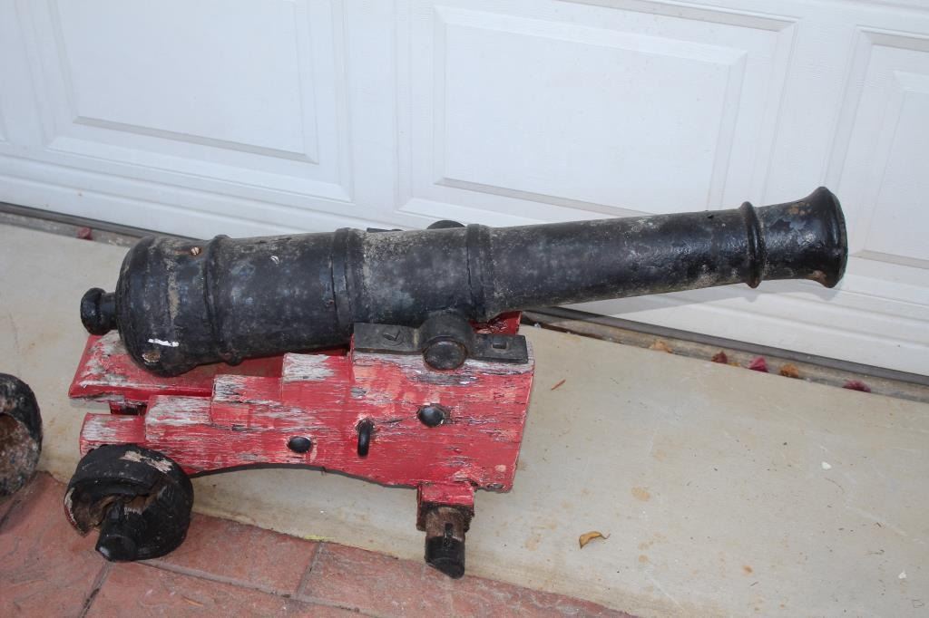 Pair of British Naval guns with 34 ½” iron tubes and 2” bores with black enamel painted finish. Mounted on later wood carriages that have deteriorated from exposure and extensive dry rot. Approximately 80lbs each.Provenance Butterfield & Butterfields 1996. Est.: $5,000-$10,000