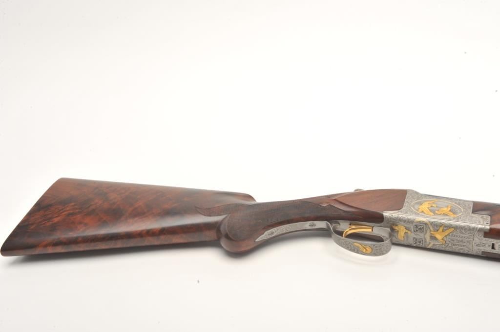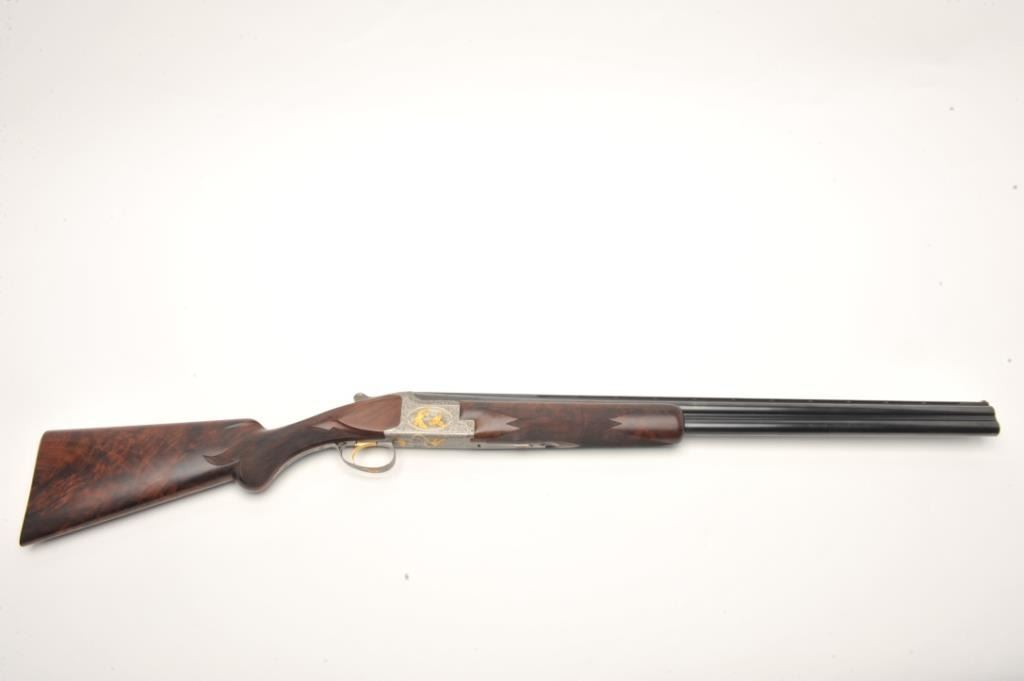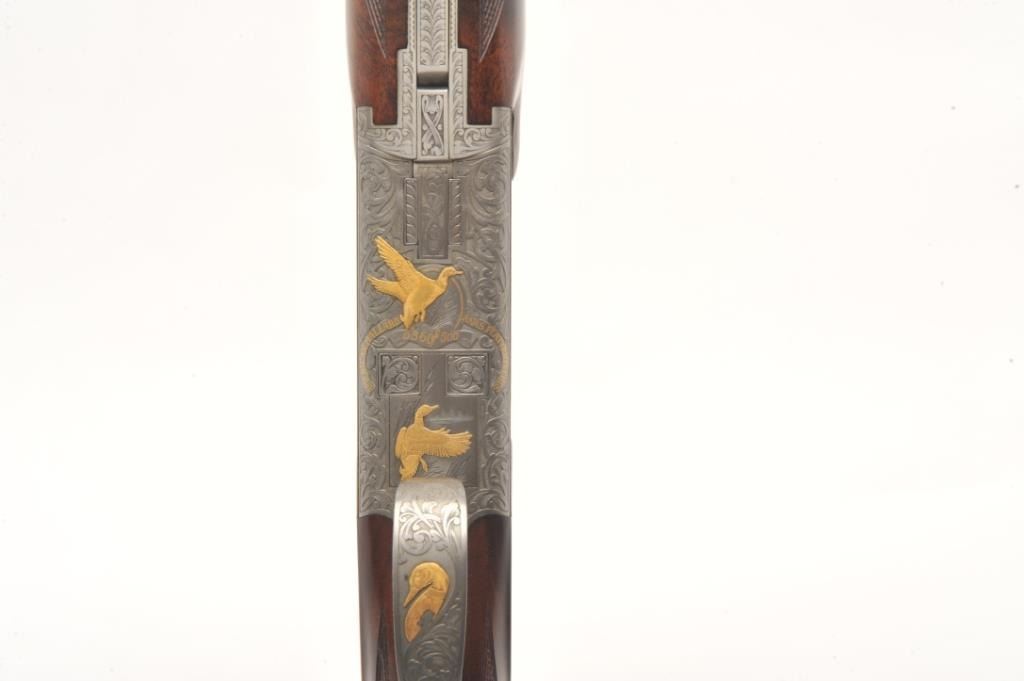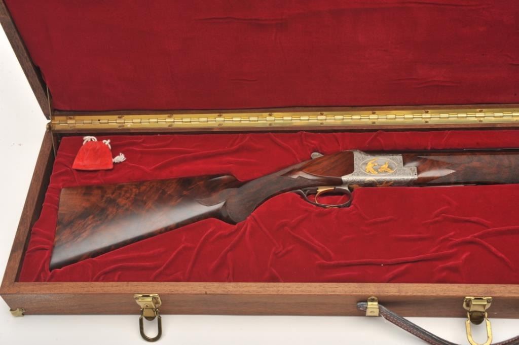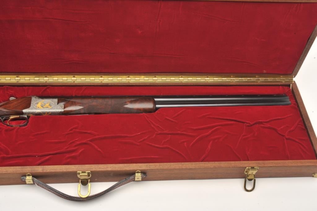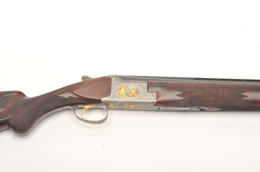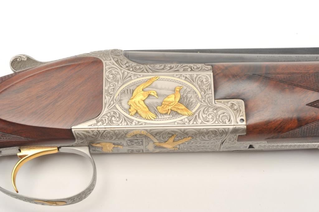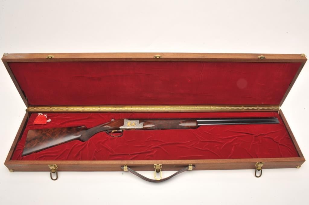 Browning Superposed High Grade American Mallard Model O/U shotgun, 12 gauge, serial #8G4PM00086. This shotgun, along with the lots before and after, comprises three matched examples of the Browning WaterfowlSuperposed Series. According to the consignor, only 13 Waterfowl sets with matching serial numbers were produced. This high grade, Belgian made Browning is as new in the box with 28” barrels featuring afull-length ventilated rib and ivory bead front sight. The upper barrel is modified choke while the lower is full choke. The shotgun barrels retain nearly all of their blued finish with only the lightest ofhandling marks. The coin finished, relief engraved receiver is finished in the white with gold inlayed game scenes on both sides depicting Mallards. The underside of the action is marked 086 of 500 in gold,indicating the limited production of the series. The shotgun comes in the original box with all associated paperwork and manuals. The finely checkered wood stocks are in excellent condition with beautiful,