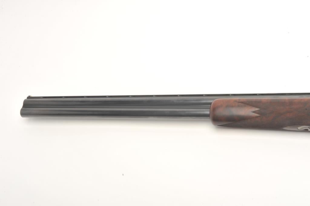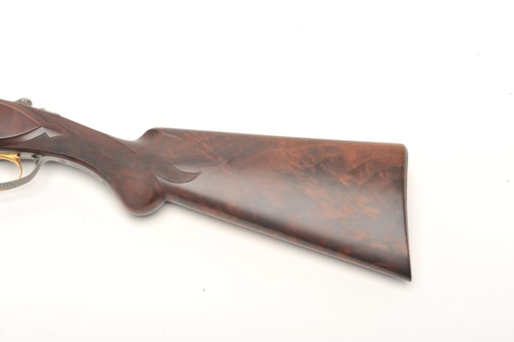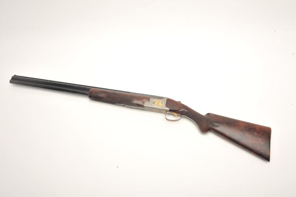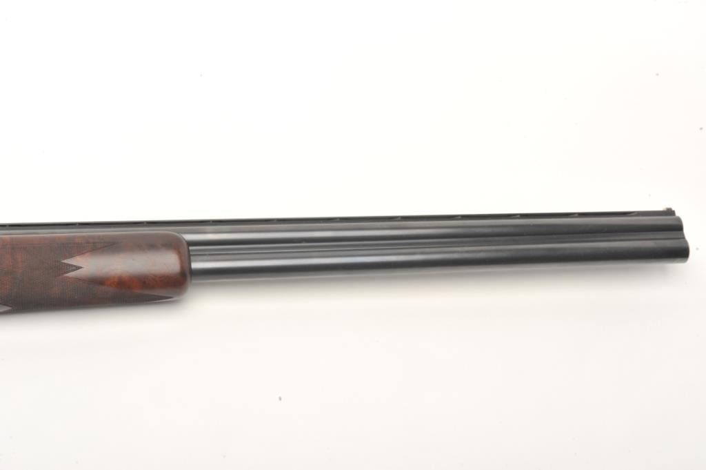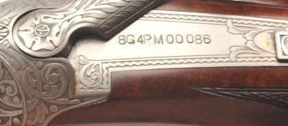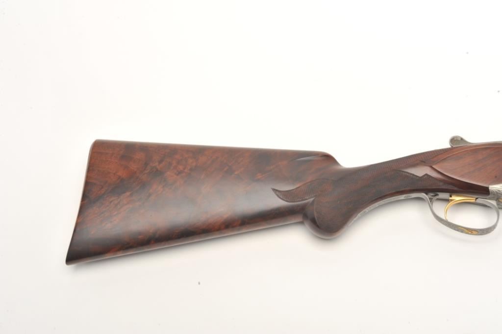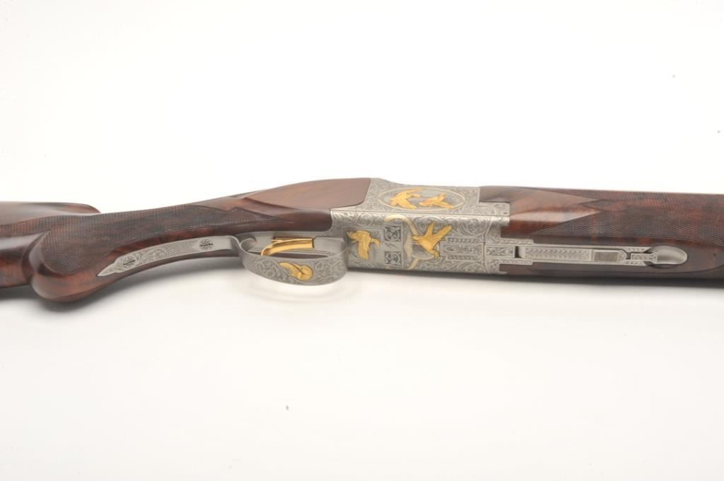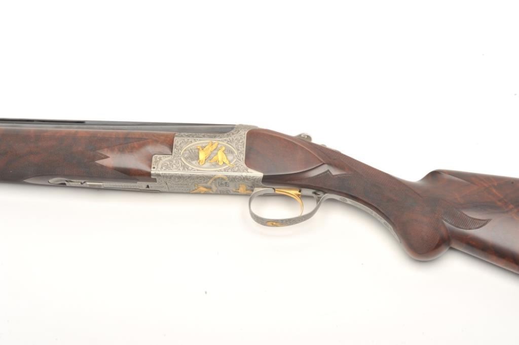 Browning Superposed High Grade American Mallard Model O/U shotgun, 12 gauge, serial #8G4PM00086. This shotgun, along with the lots before and after, comprises three matched examples of the Browning WaterfowlSuperposed Series. According to the consignor, only 13 Waterfowl sets with matching serial numbers were produced. This high grade, Belgian made Browning is as new in the box with 28” barrels featuring afull-length ventilated rib and ivory bead front sight. The upper barrel is modified choke while the lower is full choke. The shotgun barrels retain nearly all of their blued finish with only the lightest ofhandling marks. The coin finished, relief engraved receiver is finished in the white with gold inlayed game scenes on both sides depicting Mallards. The underside of the action is marked 086 of 500 in gold,indicating the limited production of the series. The shotgun comes in the original box with all associated paperwork and manuals. The finely checkered wood stocks are in excellent condition with beautiful,