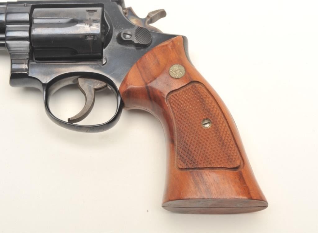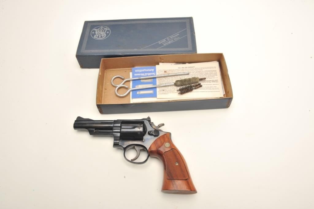 Smith & Wesson Model 19-3 DA revolver, .357 Magnum caliber, 4” barrel, blued finish, checkered wood medallion combat grips, S/N 7K17920, in overall near fine condition showing the majority of original finish witha couple of scattered spots of surface erosion from storage; fine bore, crisp action, sharp markings and overall fine grips; accompanied by a factory two piece cardboard blue box with end label numbered to this gun; also instructions and cleaning rod included. (Modern/PPT). Est.: $300-$600.