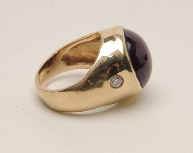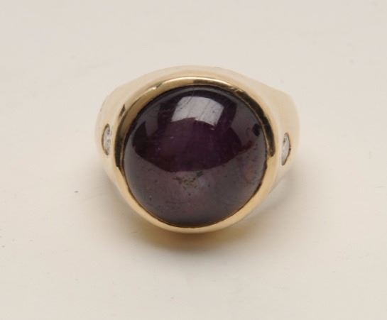 Magnificent approximately 28 CT star ruby on heavy custom 14KT mounting with 2 side diamonds. Approximately .500 scrap gold value at $1200 oz. Appraised $7900. Est.: $1500-$3000