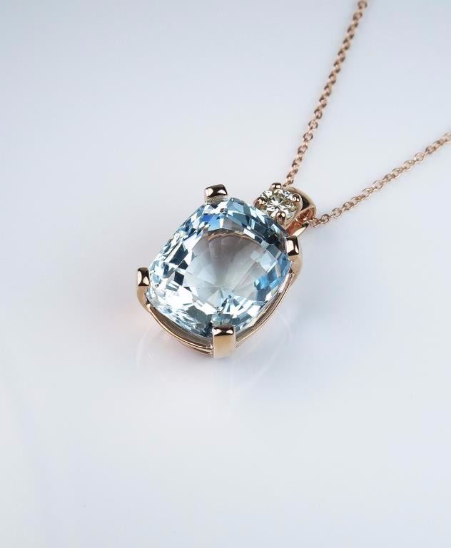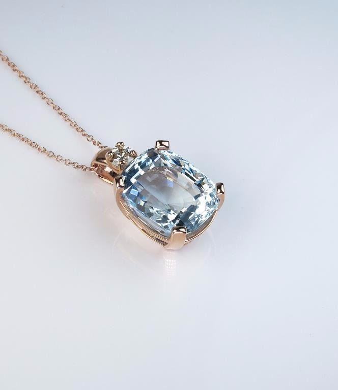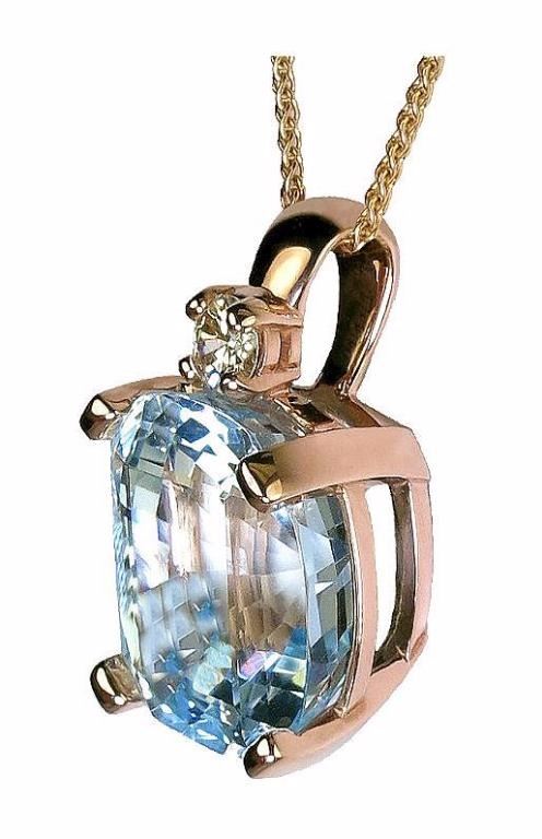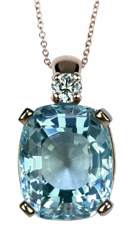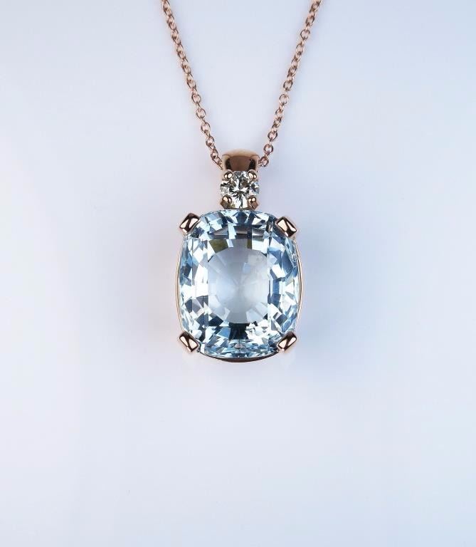 Magnificent Fine Aquamarine and Diamond Pendant set with a 35.08 carat aquamarine and accented with a round ‘IDEAL’ cut diamond weighing 0.65 carats of I color and VS clarity set in a heavy 14 karat Rose goldoriginal design setting. Retail $22,000-$25,000 Estimates $8,000-$12,000 Please see Full appraisal.