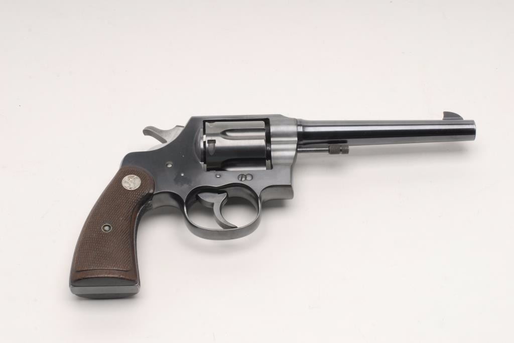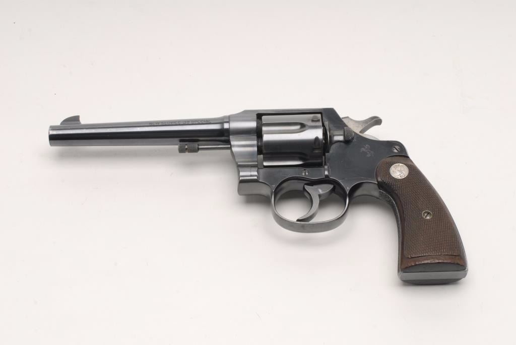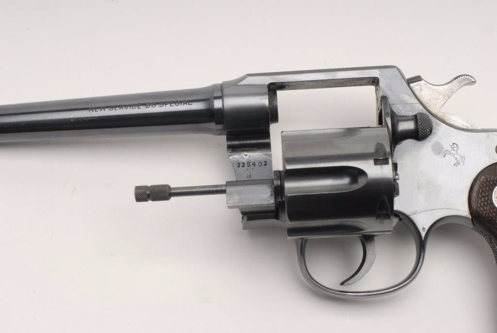 Lot 254 Colt New Service DA Revolver, .38 Special caliber, 6” barrel, blue finish, checkered wood grips, f